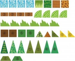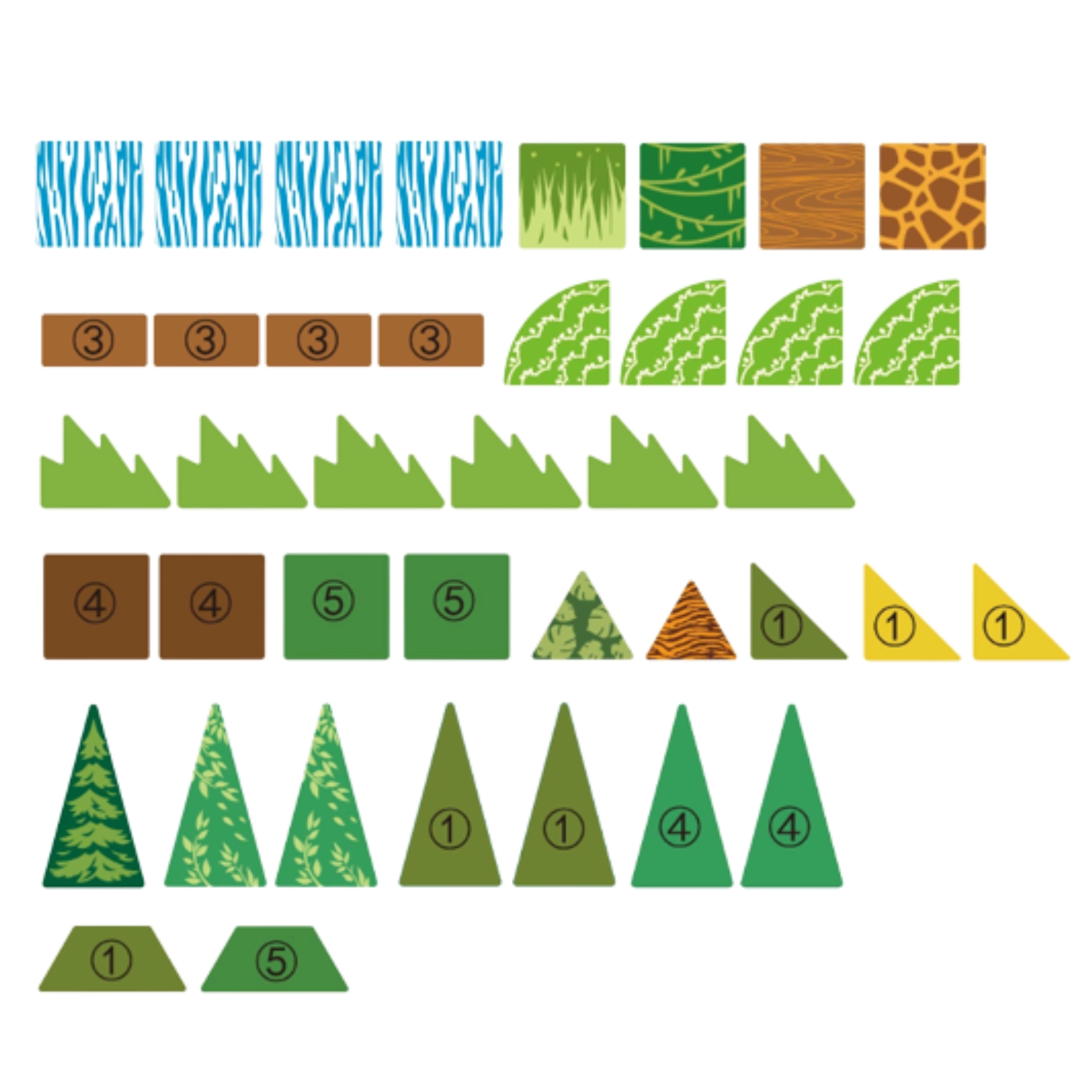 - 45 de piese în diverse forme și culori, incluzând cascadă, arcadă, arbuști și copaci
