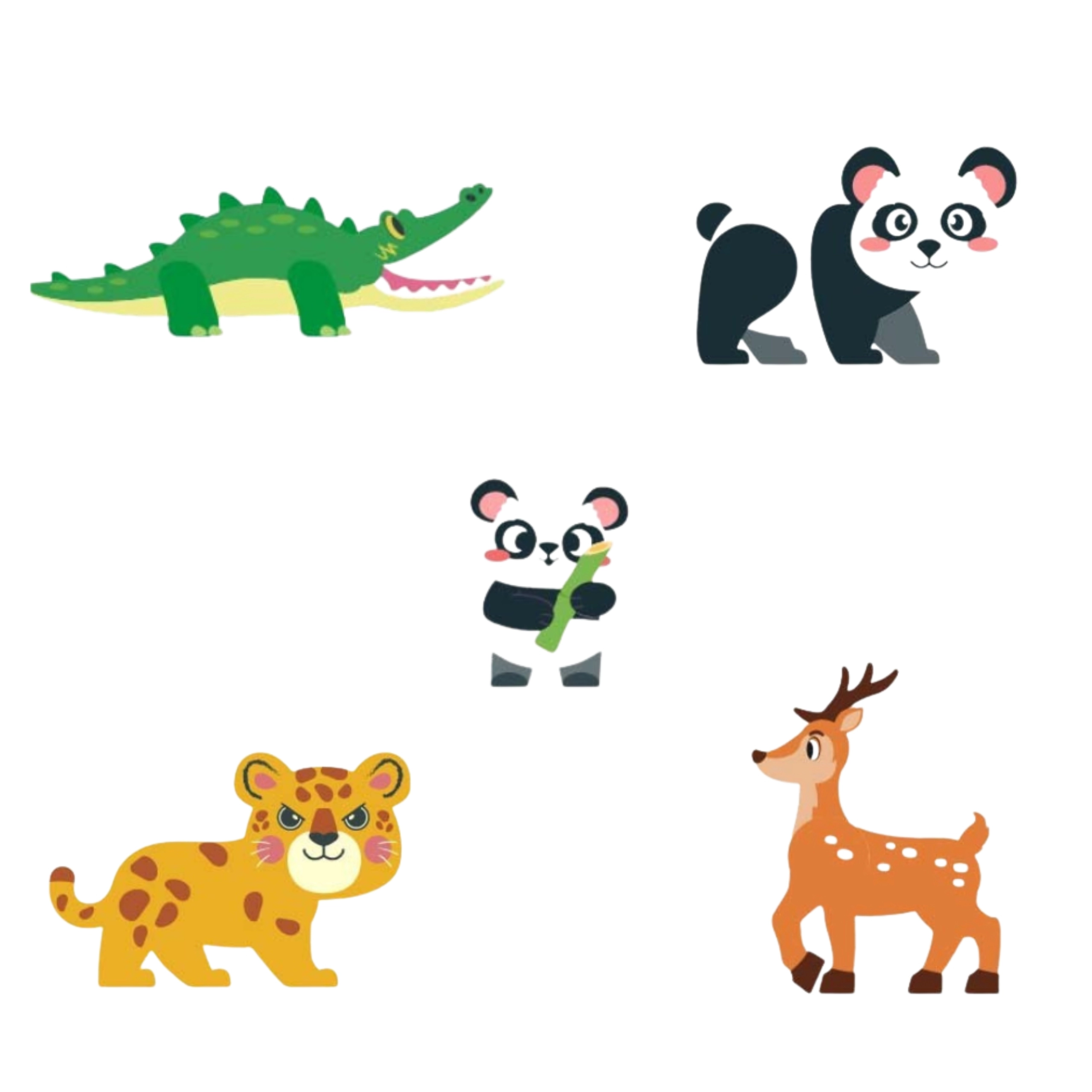 - Figurine de animale: 2× panda, leopard, cerb, crocodil