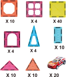 - 92 de cuburi magnetice colorate, 20 de mașinuțe metalice, cutie de depozitare