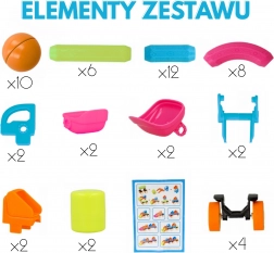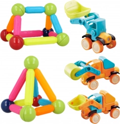 - 10 bile magnetice, 12 tije magnetice scurte, 8 tije magnetice curbate, 16 piese pentru construirea vehiculelor
