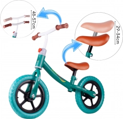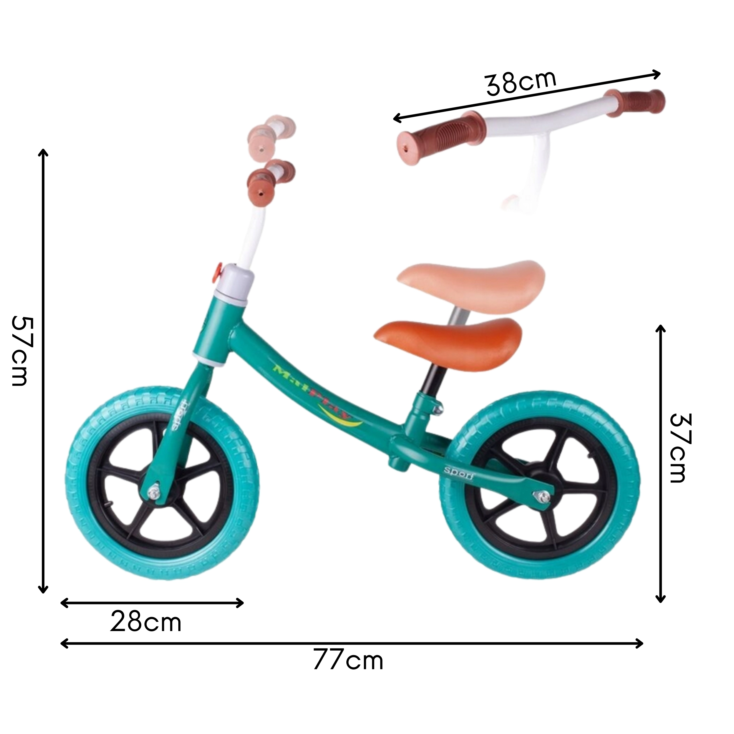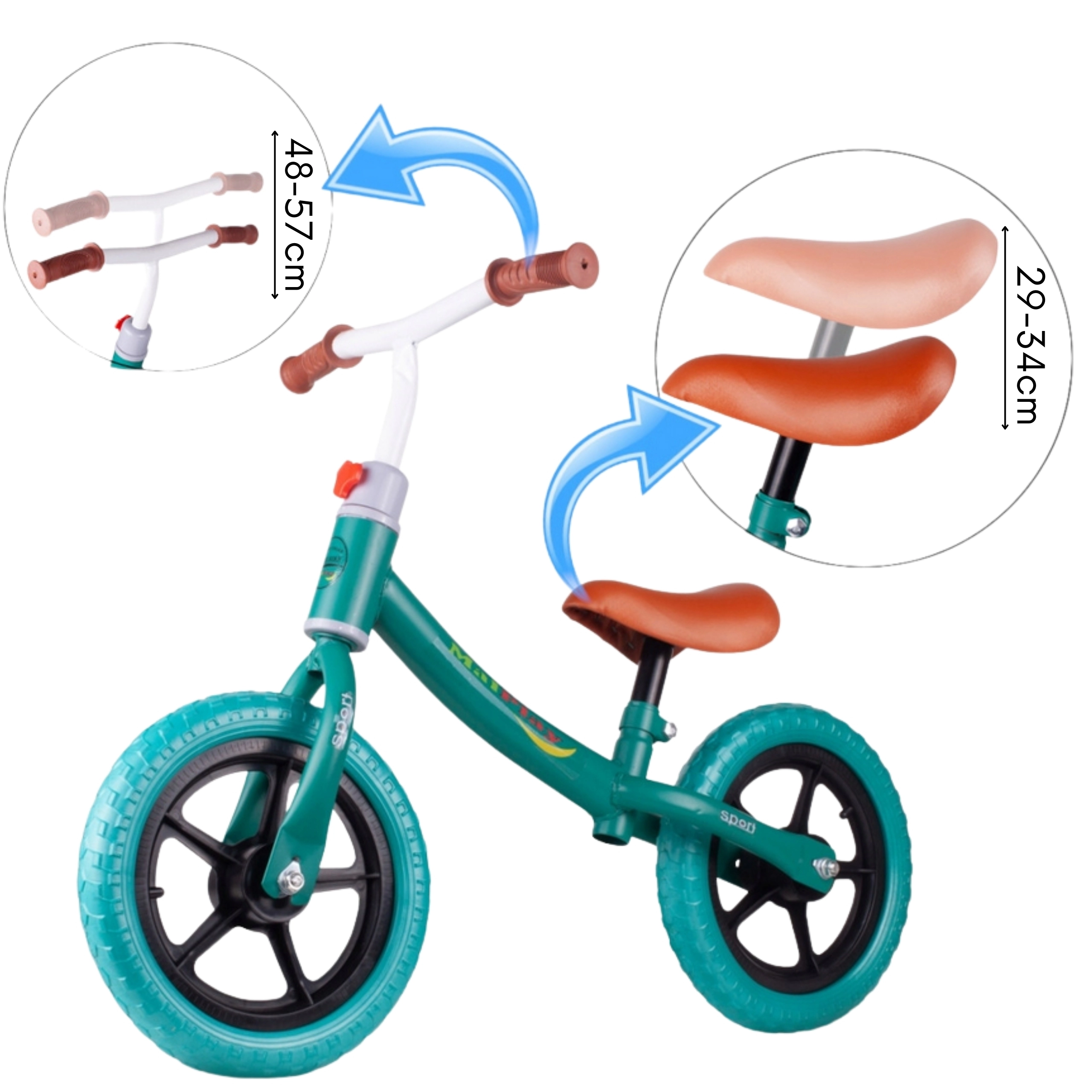 Bicicleta se adaptează ușor staturii copilului datorită ghidonului reglabil (48–57 cm) și șeii (31–40 cm). Forma ergonomică, șaua moale și mânerele antiderapante asigură confort și o prindere sigură la mers.