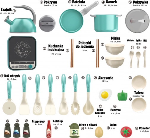 - Set de 30 de piese – tot ce este necesar pentru o mică bucătărie.