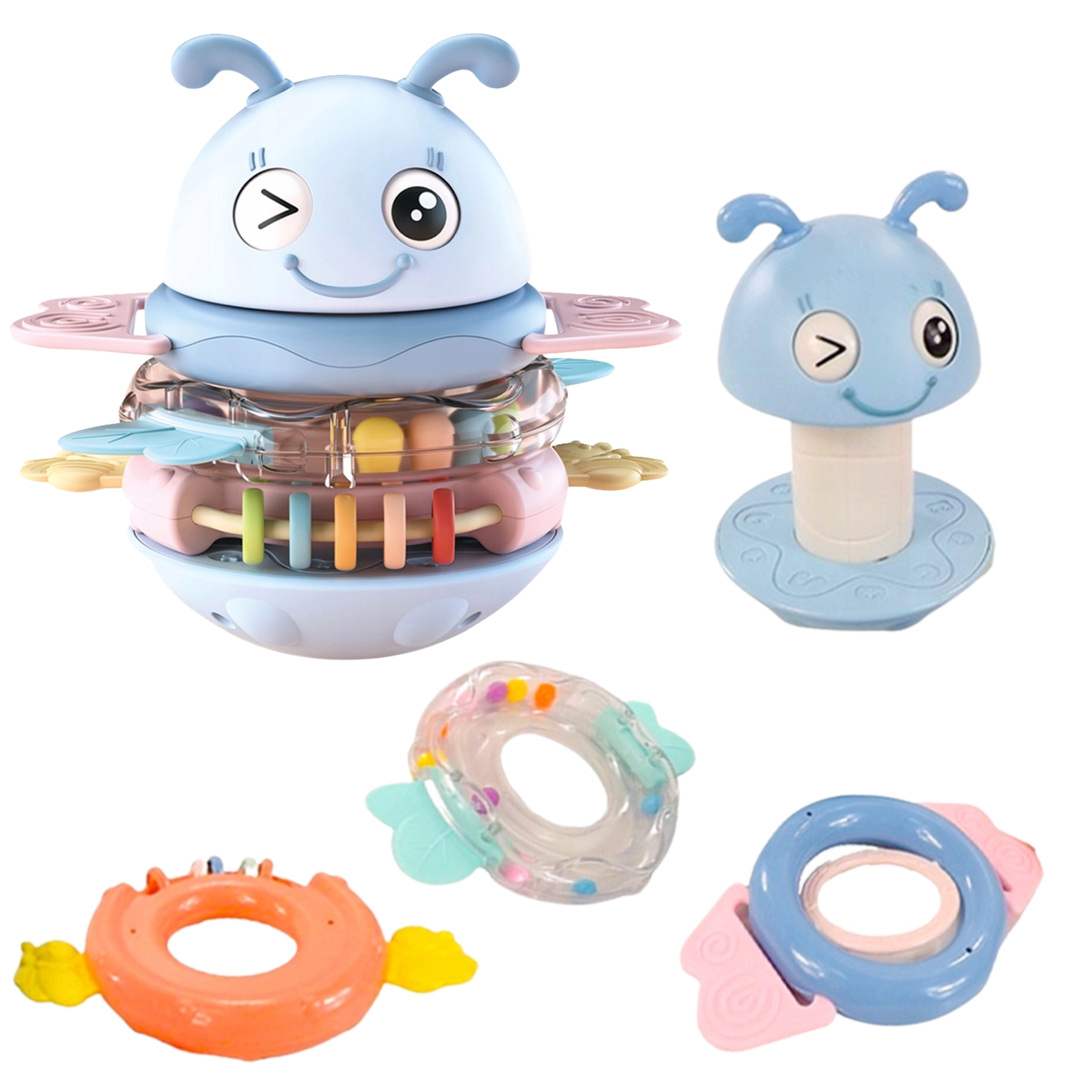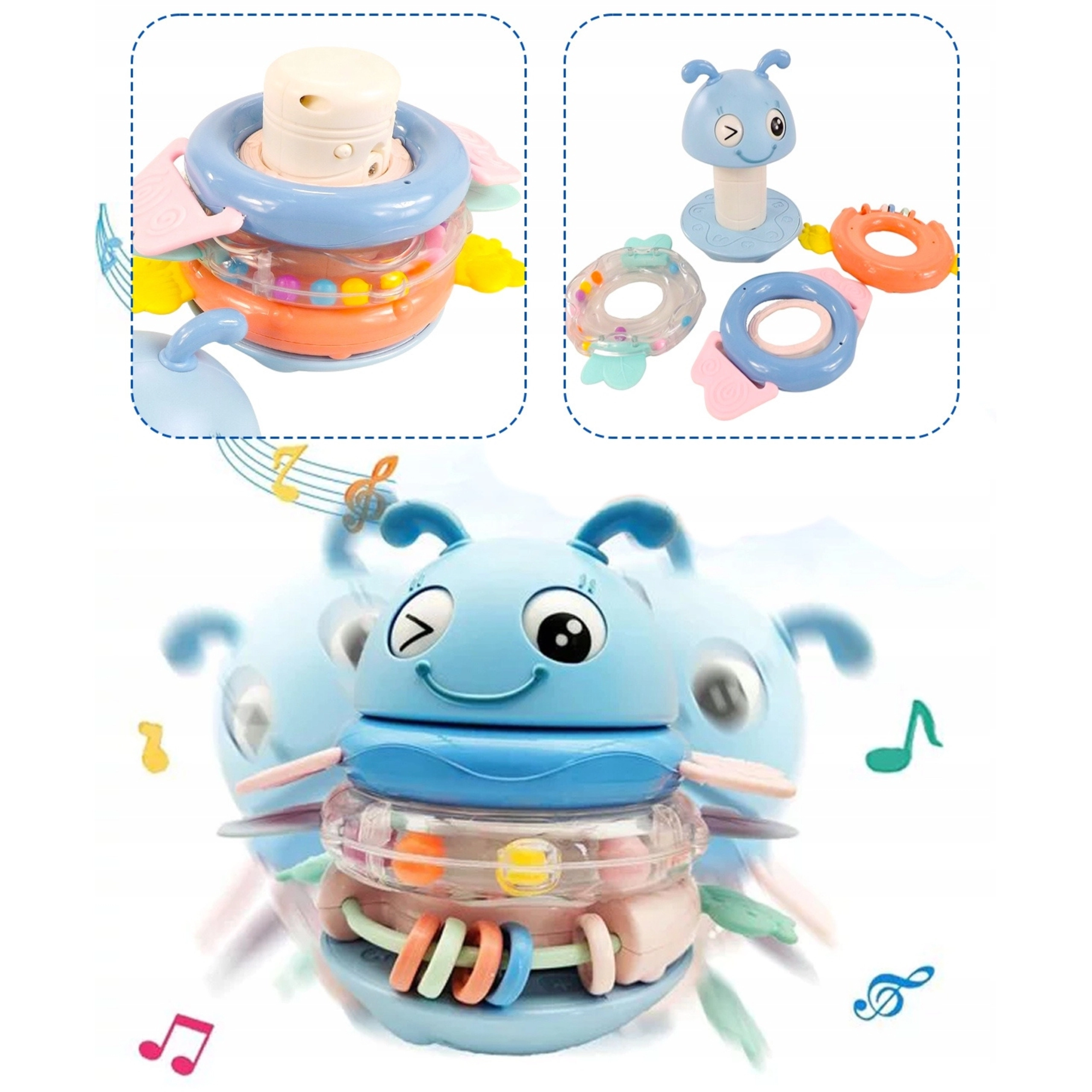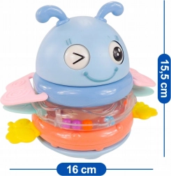 Această drăgălașă „libelulă” îi atrage pe bebeluși prin culori, mișcare și sunete. Inelele funcționează ca zdrăngănitori și inele de dentiție și pot fi folosite separat sau așezate pe suportul cu 2 moduri sonore (melodii și efecte haioase). Datorită proeminențelor moi din silicon, masează delicat gingiile în timpul erupției dinților.