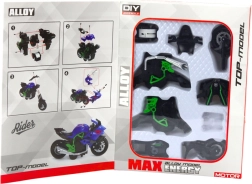 Set de construcție a unei motociclete din metal la scară 1:14 îi va încânta atât pe micii constructori, cât și pe pasionații de motoare. Piesele realiste în combinație verde‑negru creează, după asamblare, un model impresionant. Construcția dezvoltă motricitatea fină, gândirea logică, concentrarea și aduce bucuria unei creații realizate manual.
