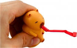 Capibara maro cu trompetă roșie este realizată din material plăcut, moale și elastic, care se potrivește perfect pentru strâns în mână și susține relaxarea. La apăsare se activează sunetul de fluier și din guriță iese trompeta, transformând jucăria într-un accesoriu antistres excelent și o distracție originală pentru grupuri.