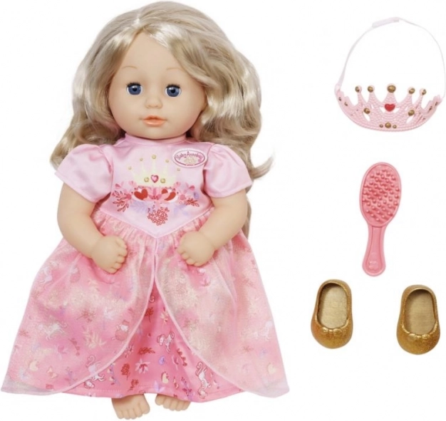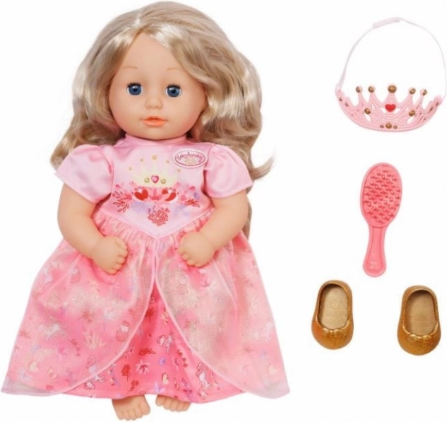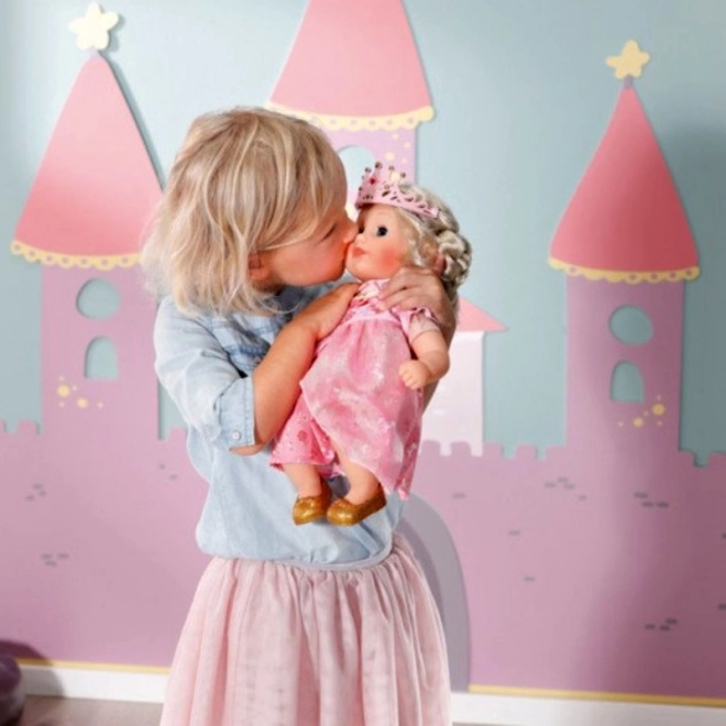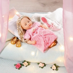 Sub rochița roz cu volan din tulle, strălucesc balerinele aurii care completează aspectul său regal. Datorită croiului ușor accesibil “easy fit” al rochiei, îmbrăcarea este o joacă de copii chiar și pentru mânuțele mici. Păpușa susține dezvoltarea creativității și responsabilității la copii deja de la un an.