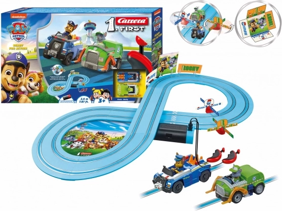 Pista auto distractivă CARRERA FIRST cu motivul Paw Patrol oferă copiilor de la 3 ani primele experiențe de curse. Include mașinuile Chase și Rocky, controlere simple, elice rotative pentru mai multă tensiune și o pistă cu lungimea de 2,4 m. Alimentarea pe baterii asigură utilizarea ușoară oriunde, iar montajul facil cu sistem de cleme îi va bucura pe părinți.