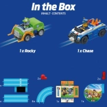 Cu mașinuțele Chase și Rocky, copiii pornesc pe un circuit colorat cu elice rotative și tematică PAW Patrol pentru și mai multă distracție.