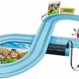 Pista cu lungimea de 2,4 m oferă linii drepte, curbe și două elice rotative care sporesc distracția în timpul trecerii. Asamblarea este rapidă și stabilă datorită suporților cu înălțime reglabilă și sistemului de cleme. Alimentarea cu 4× baterii C oferă până la 6 ore de rulare, astfel încât copiii se pot bucura de multe curse fără întreruperi.