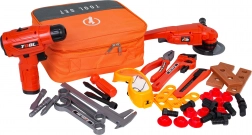 - geantă, bormașină/înșurubător cu acumulator, polizor unghiular, șubler, cheie reglabilă, cheie inelară și cheie plată, clești, cuțit, șurubelniță cu adaptor și biți, ochelari de protecție, 7× element pentru înșurubare, 10× piuliță, 10× șurub