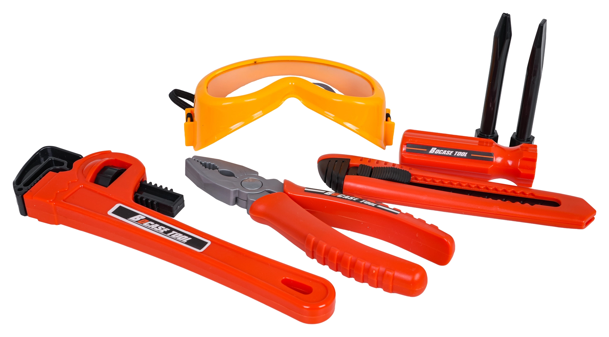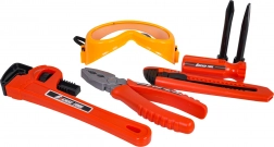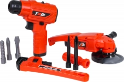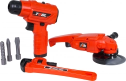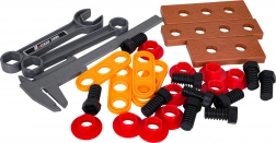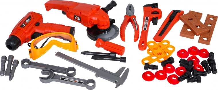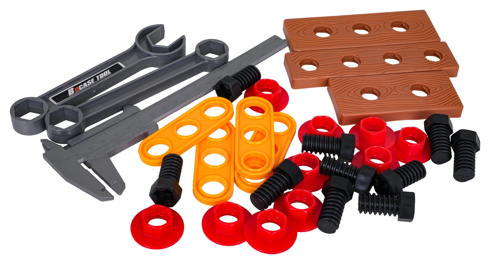 Sunt incluse și polizorul unghiular cu disc rotativ manual, seturi de chei, clești, cuțit, șurubelniță cu biți, șubler (riglă culisantă) și ochelari de protecție. Copiii își pot antrena motricitatea fină, logica și imaginația conectând piesele cu șuruburi și piulițe.