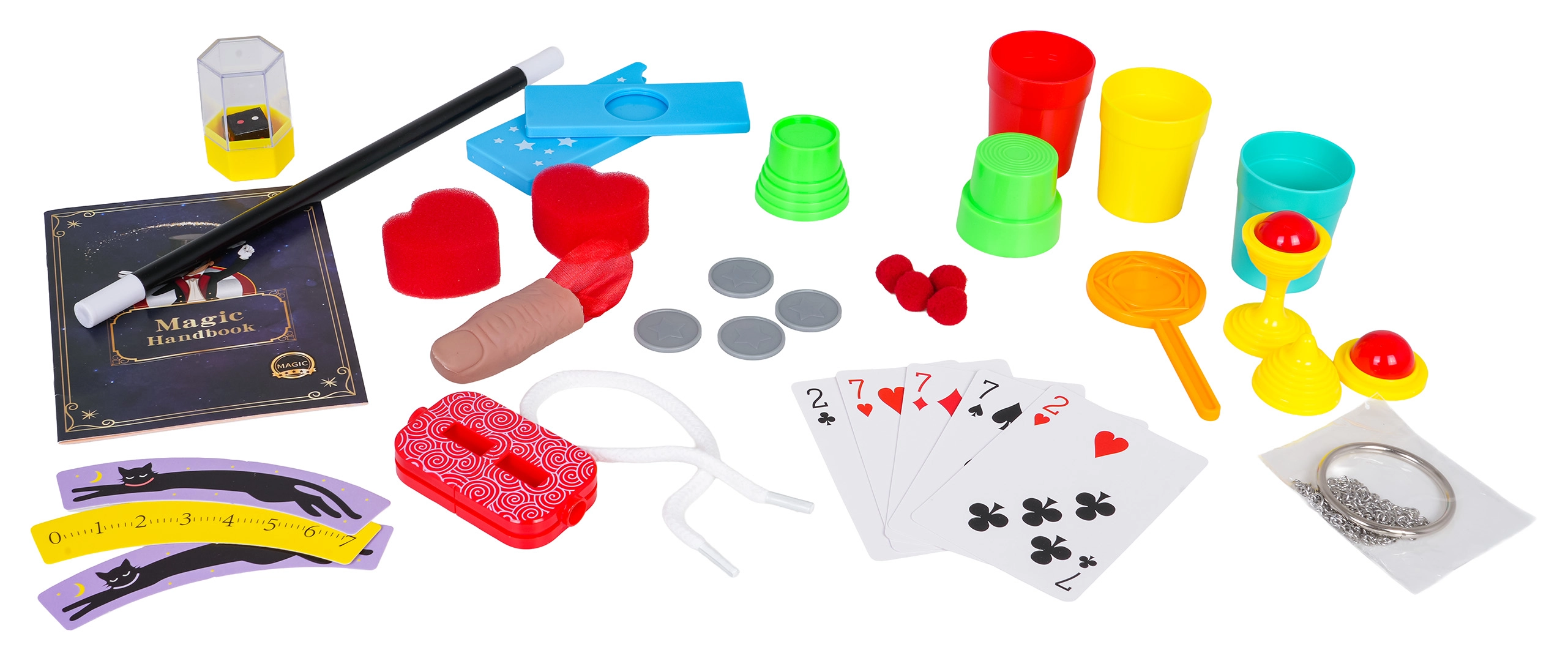 În pachet veți găsi diverse accesorii de magie – de la bagheta magică, pahare și monede până la recuzită specială pentru a dirija atenția publicului. Fiecare truc este explicat clar și adaptat copiilor, pentru ca ei să se bucure de succes și să-și construiască încrederea în sine.