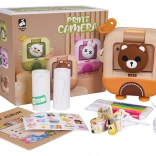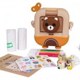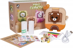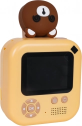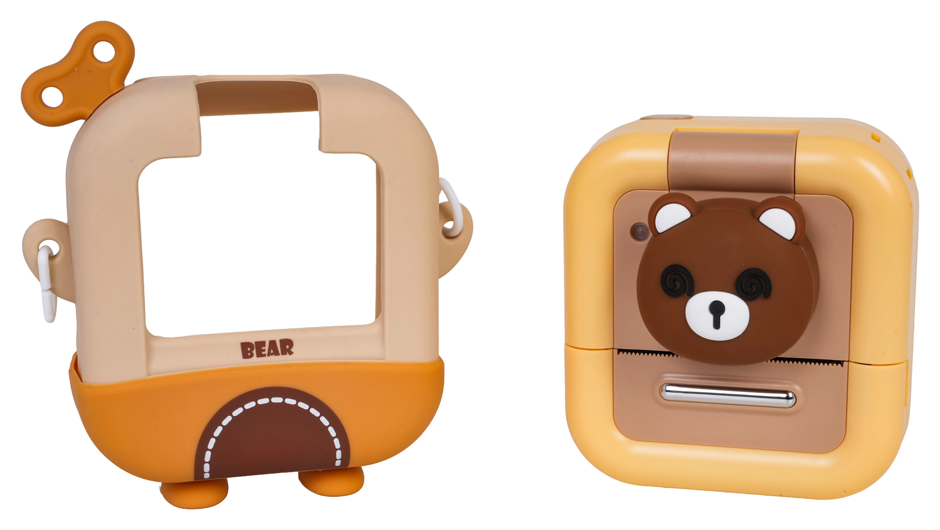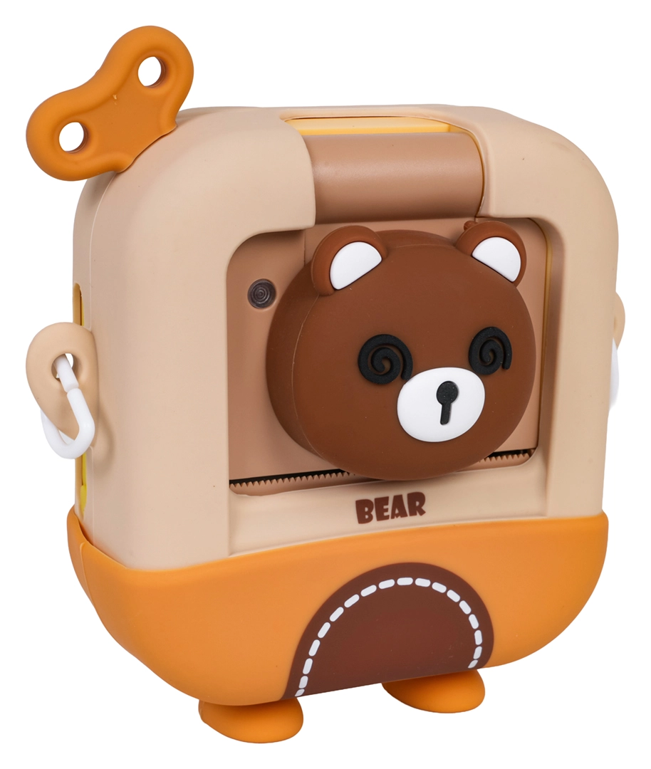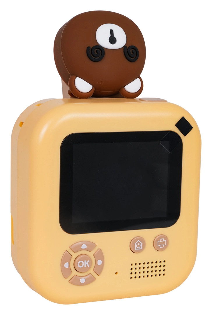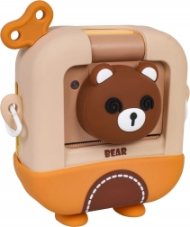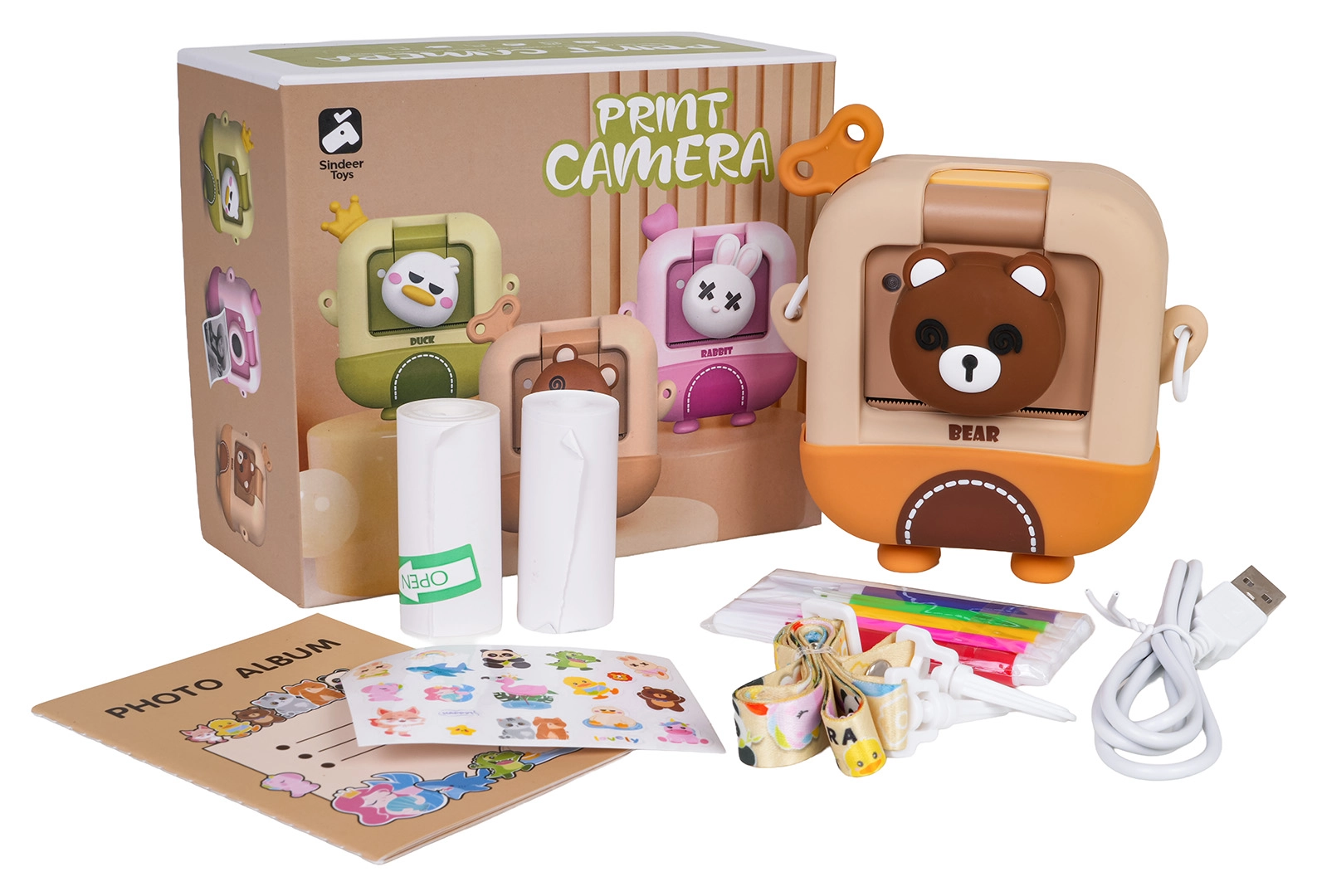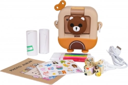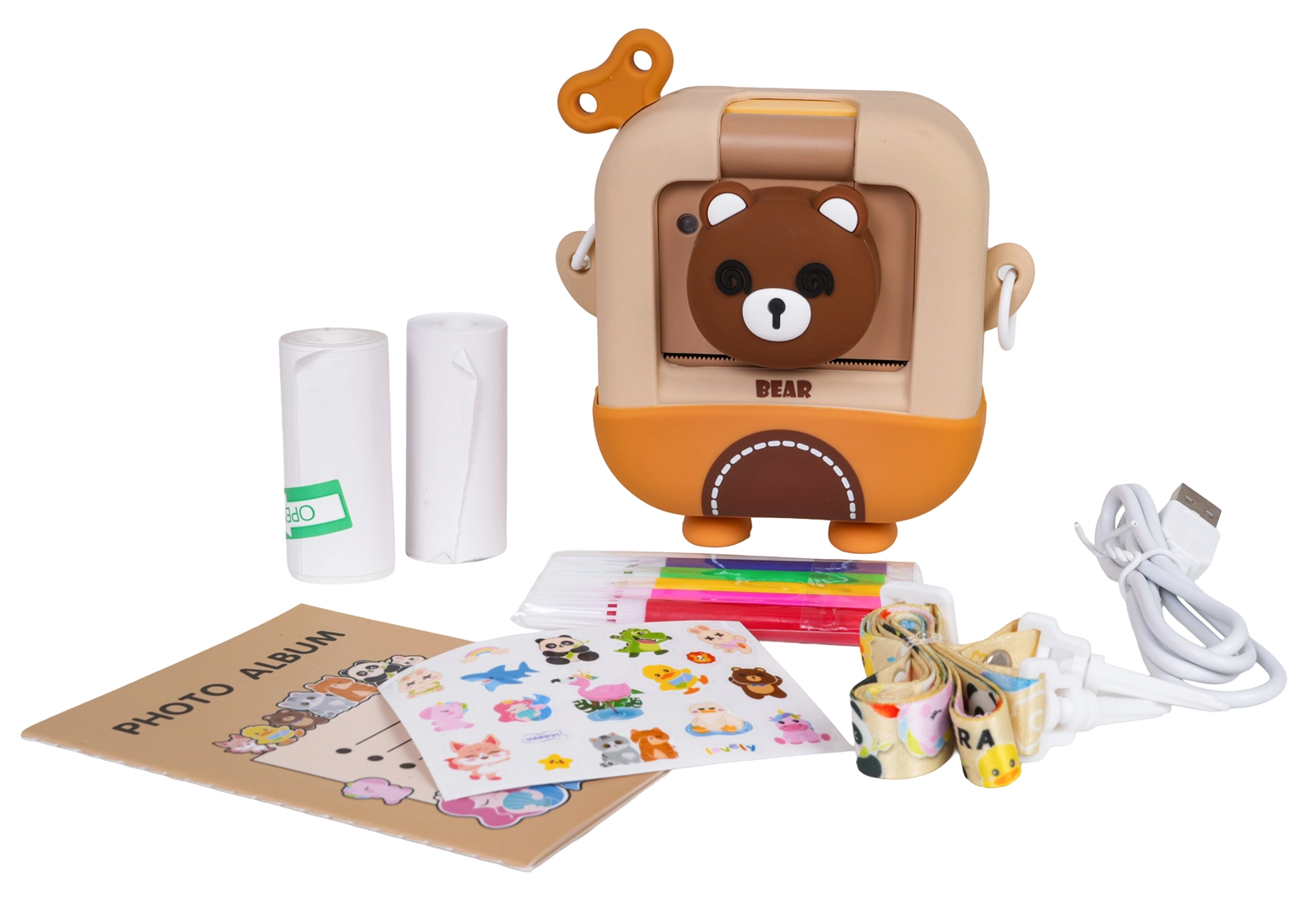 Aparat foto adorabil pentru copii cu motiv ursuleț, care poate imprima instantaneu fotografiile alb-negru pe hârtie termică imediat după capturare. Setul include accesorii bogate, printre care 2 role de hârtie termică, markere colorate pentru a colora fotografiile, cablu USB, lanyard, abțibilduri și mini album. Aparatul suportă înregistrare video și efecte amuzante și este alimentat de baterie reîncărcabilă 3,7 V inclusă – un cadou creativ ideal pentru copii de la 3 ani în sus.