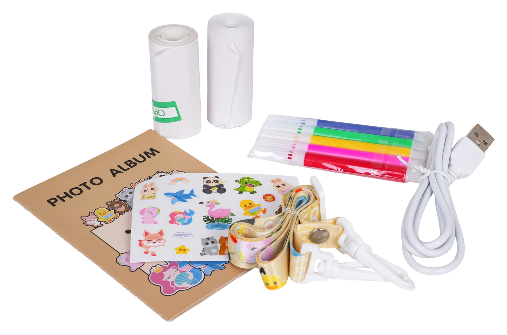 - 2× rolă de hârtie termică, husă, lanyard, cablu USB, abțibilduri, 5× marker, mini album foto, autocolante decorative, manual