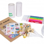 Două role de hârtie, markere, abțibilduri, mini album, lanyard și cablu USB – tot ce le trebuie copiilor pentru a crea propriile povești foto.