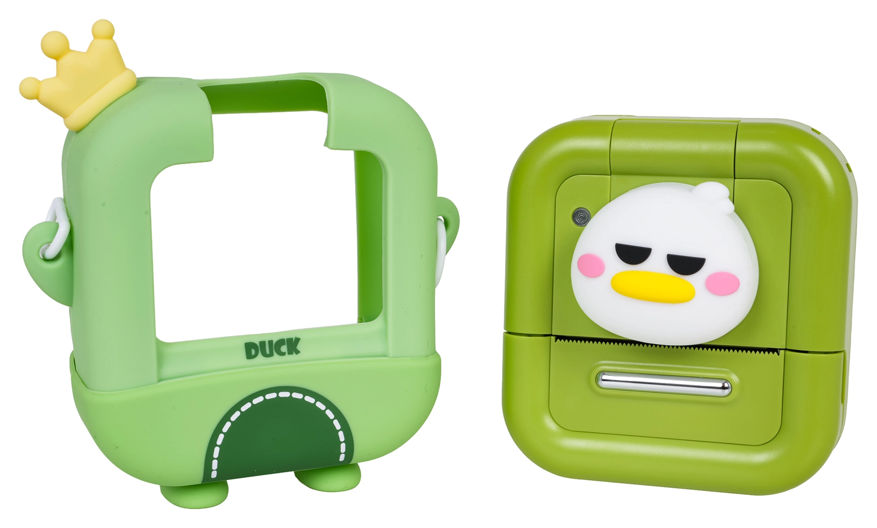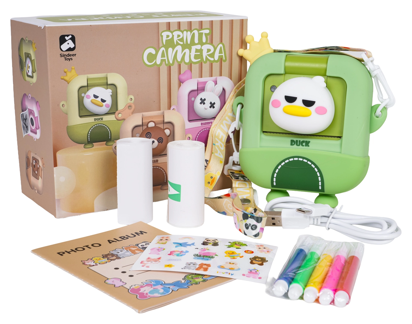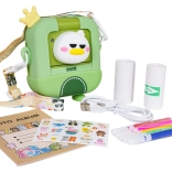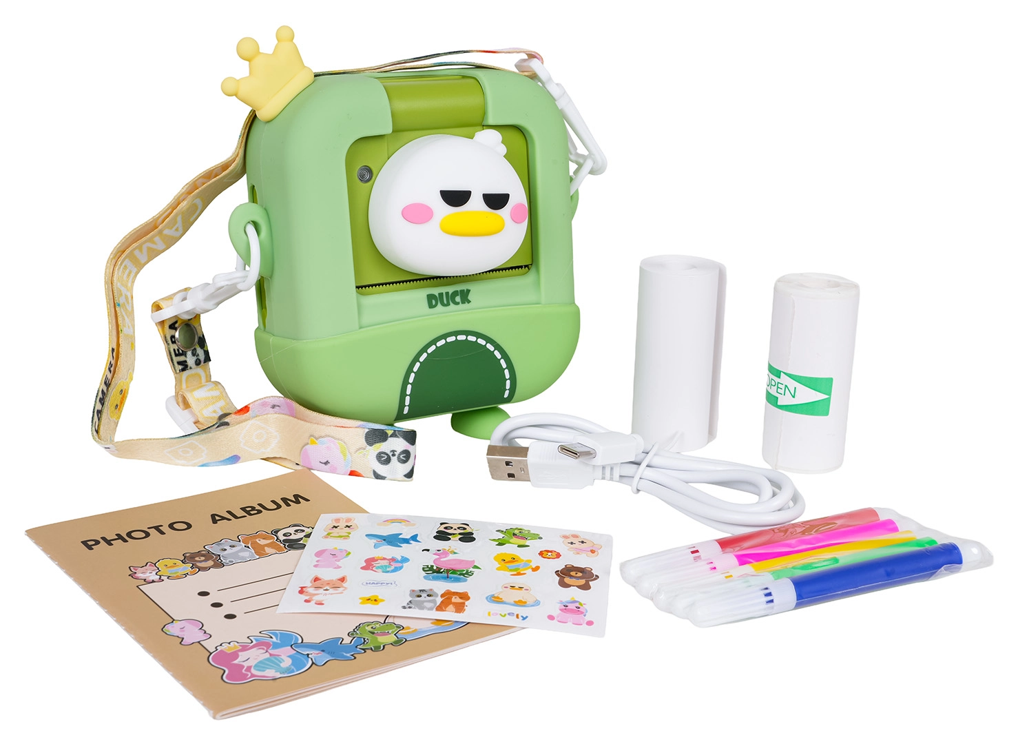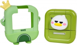 - Aparat foto cu motiv de rățușcă, husă de protecție, 2× rolă de hârtie termică, șnur, cablu USB, album foto, 5 markere, autocolante, stickere decorative, manual