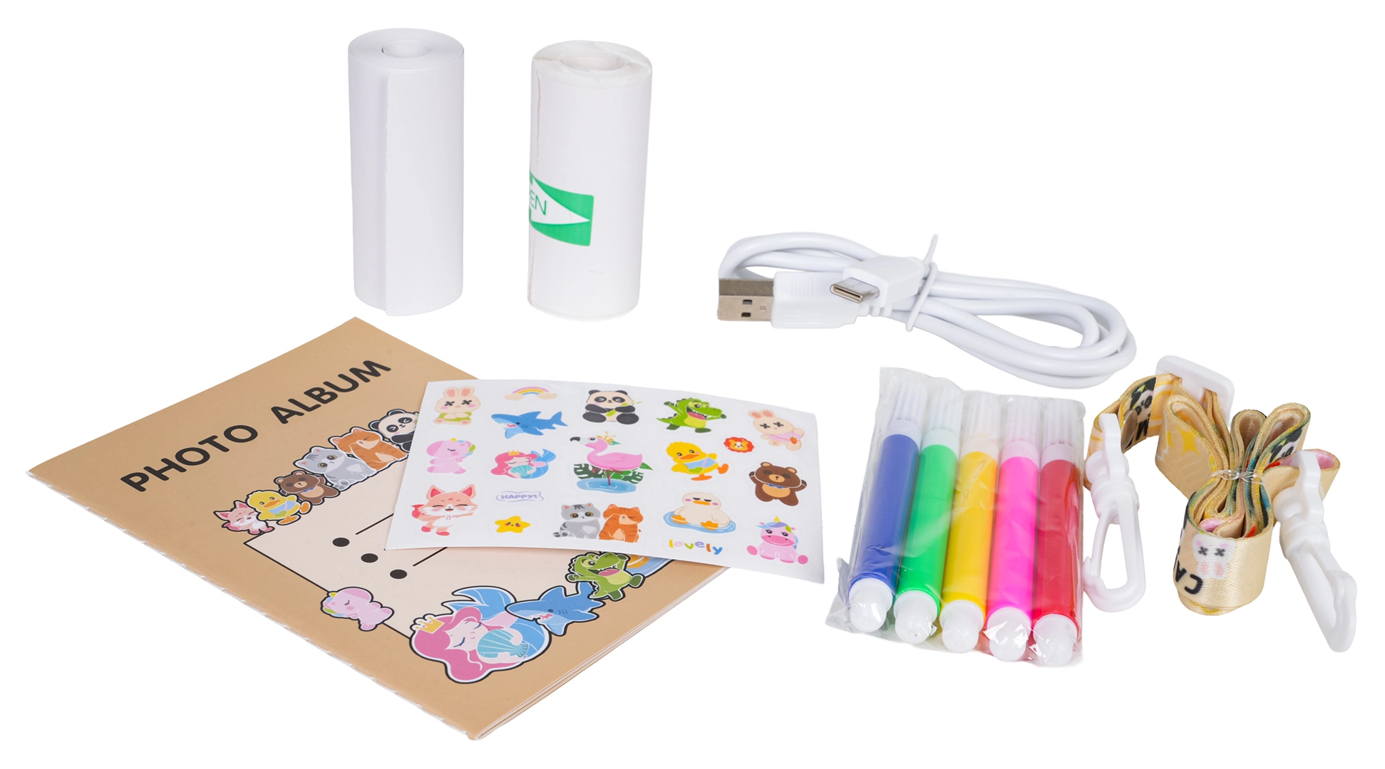 Album foto, 2 role de hârtie, cablu USB, șnur, autocolante și 5 markere colorate – echipare completă pentru a crea propriile amintiri.