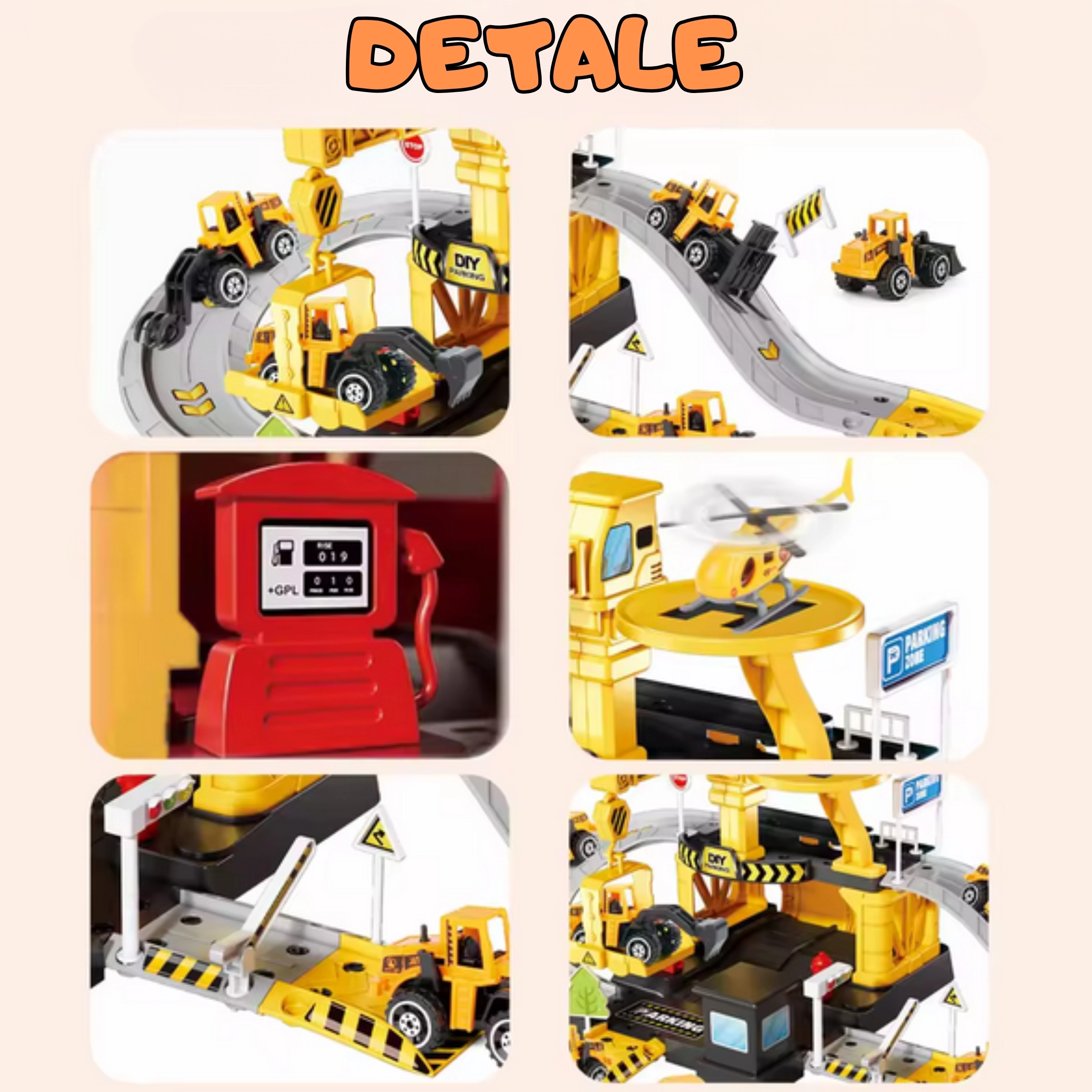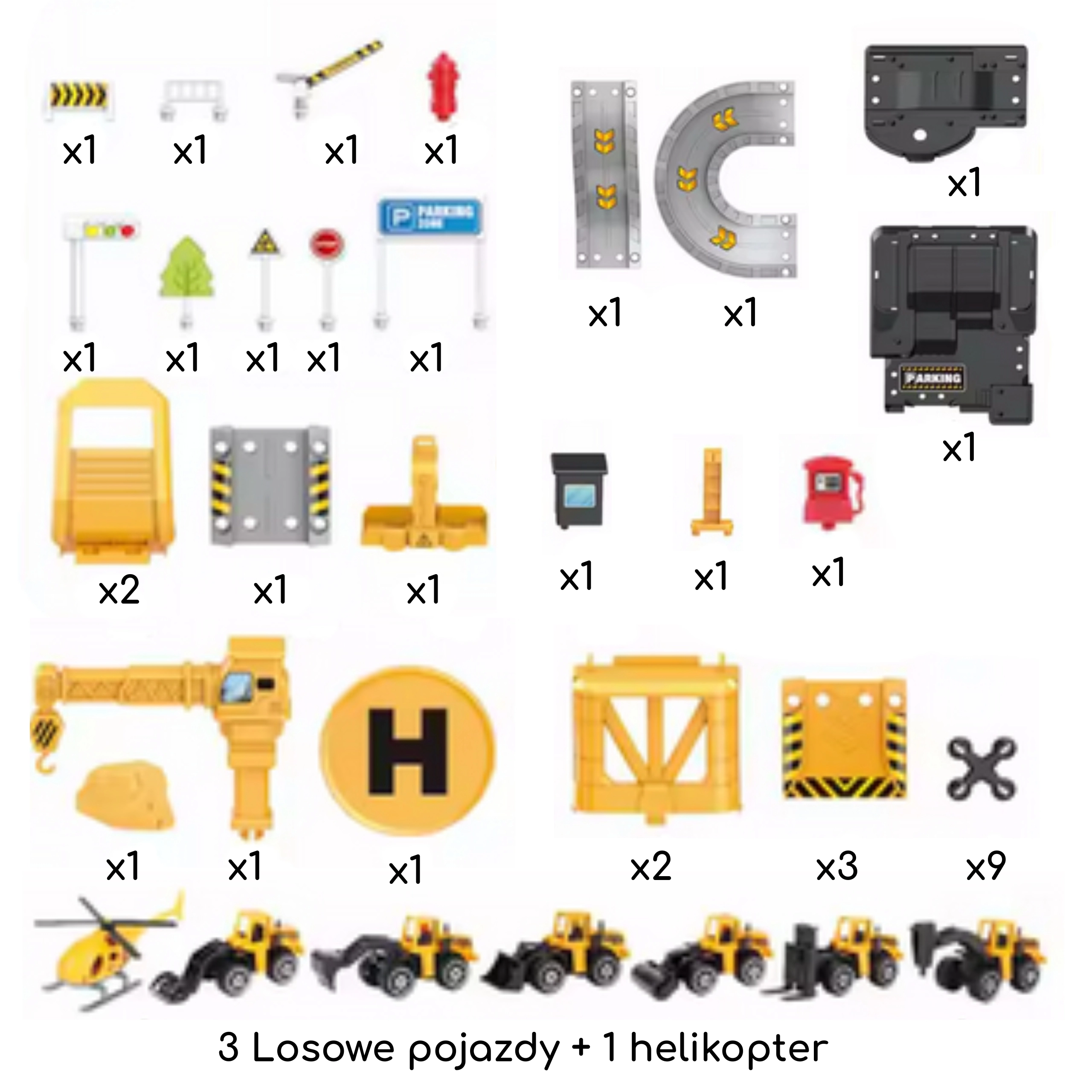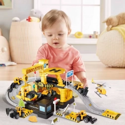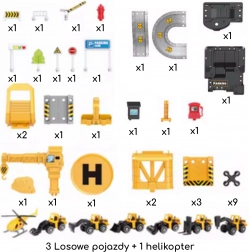 Setul conține 41 de elemente, inclusiv 3 mașinuțe de construcții metalice (modele aleatorii) și un elicopter, astfel încât copiii își pot crea propriile scenarii și se pot juca singuri sau cu prietenii. Construcția din plastic rezistent și culorile vii asigură o joacă sigură și atractivă pentru copiii de la 3 ani.