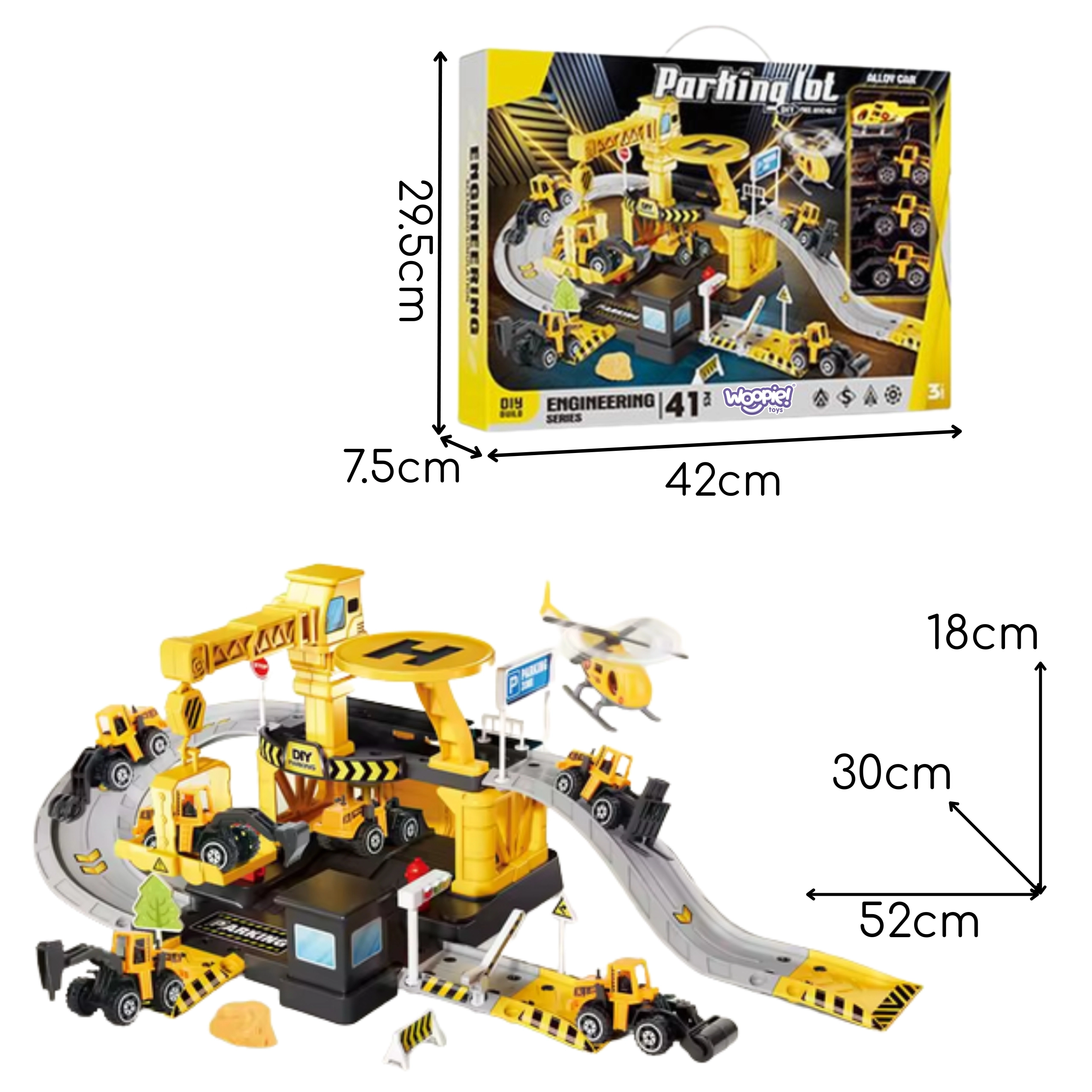 Garajul de construcții WOOPIE este o parcare pe două niveluri cu rampe, tobogane și heliport, care, datorită detaliilor realiste, îi introduce pe copii în lumea construcțiilor. Macara acționată mecanic cu funcție de lift, stație de alimentare, bariere, semafoare și gheretă de pază susțin role-play și ore îndelungate de distracție.