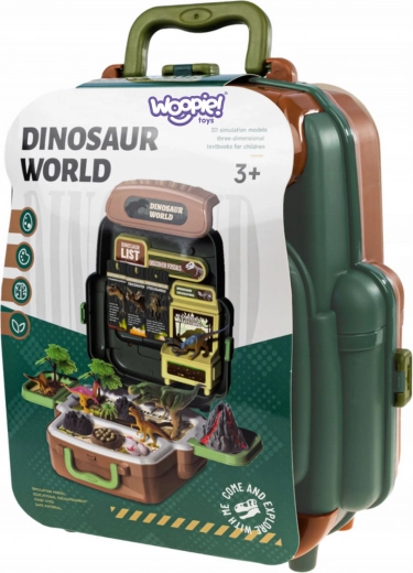 Geanta Dinosaur World îi poartă pe copii în fascinanta epocă a dinozaurilor. După deschidere, ia naștere o scenă de joacă cu teren, copăcei și accesorii, unde copiii își pot crea propriile povești. Setul include figurine colorate ale diferitelor specii de dinozauri, ouă, un vulcan și accesorii pe tema descoperirii fosilelor.