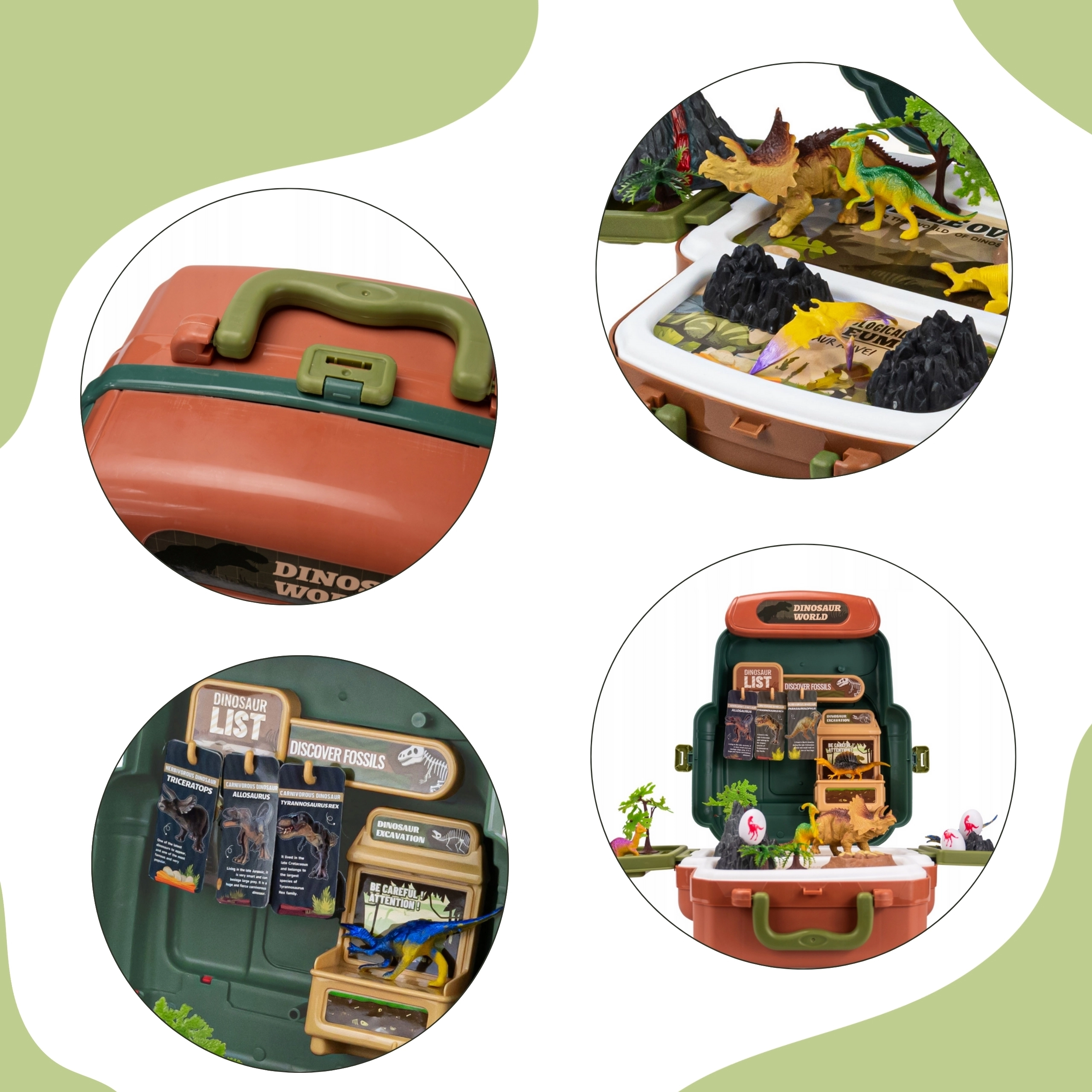 - Geantă cu scenă interioară, mai multe tipuri de figurine de dinozauri, vulcan, pietre, cuib și ouă, copaci și plante, mici unelte/accesorii, carduri educative