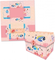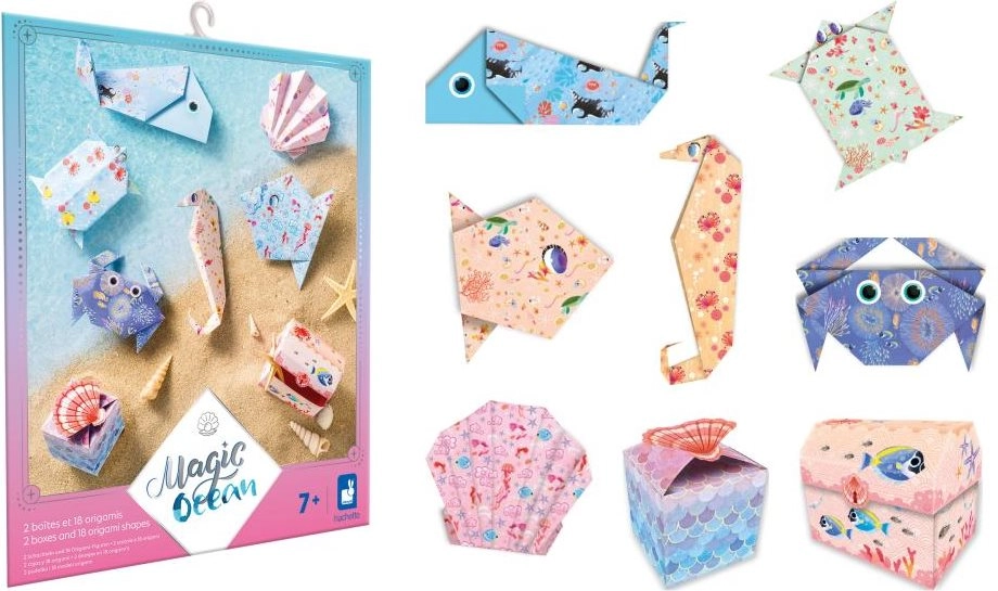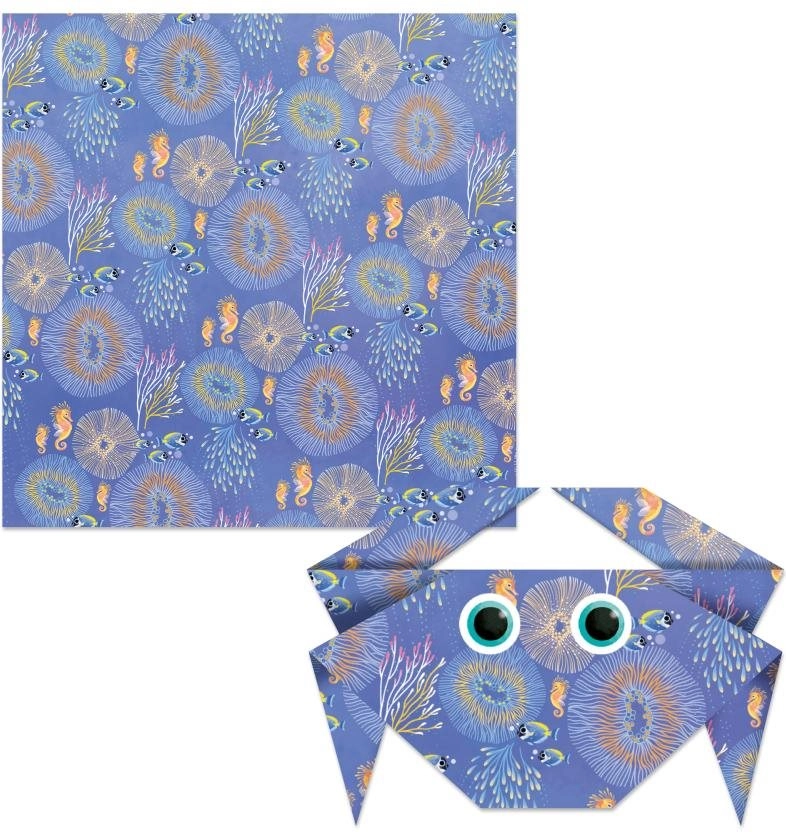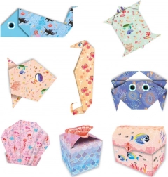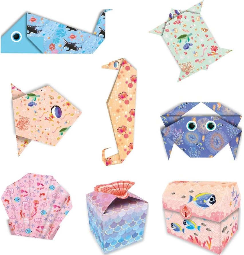 Din foile pretipărite vei plia cu ușurință pești, o broască țestoasă, un crab, un căluț de mare, precum și cutiuțe mici și cufărașe pentru comori.