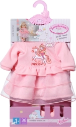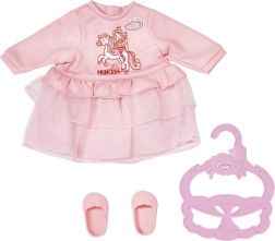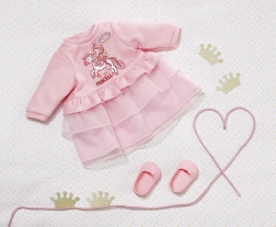 Îmbrăcați-o pe Baby Annabell în setul minunat care o transformă într-o mică prințesă. Rochița roz jucăușă cu broderie a prințesei pe cal este completată de o fustă drapată pe straturi pentru un aspect perfect.