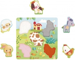 Acest puzzle din lemn de înaltă calitate aduce copiilor nu doar bucuria jocului, ci și explorarea senzorială. Sub cele cinci piese se găsesc texturi tactile care imită blana sau pielea animalelor ilustrate, susținând dezvoltarea senzorială și curiozitatea naturală.