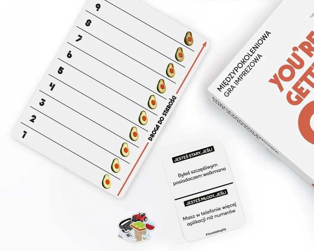 „You’re Getting Old” este un joc de cărți neconvențional care transformă orice seară cu prietenii într-o avalanșă de râsete. Trageți cărți cu afirmații despre ce este „tânăr” și ce ține deja de „școala veche”, iar în funcție de propriile reacții înaintați sau dați înapoi pe tablă. Câștigă cel care nu se lasă atras spre finish și rămâne cât mai aproape de start.