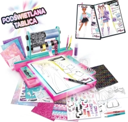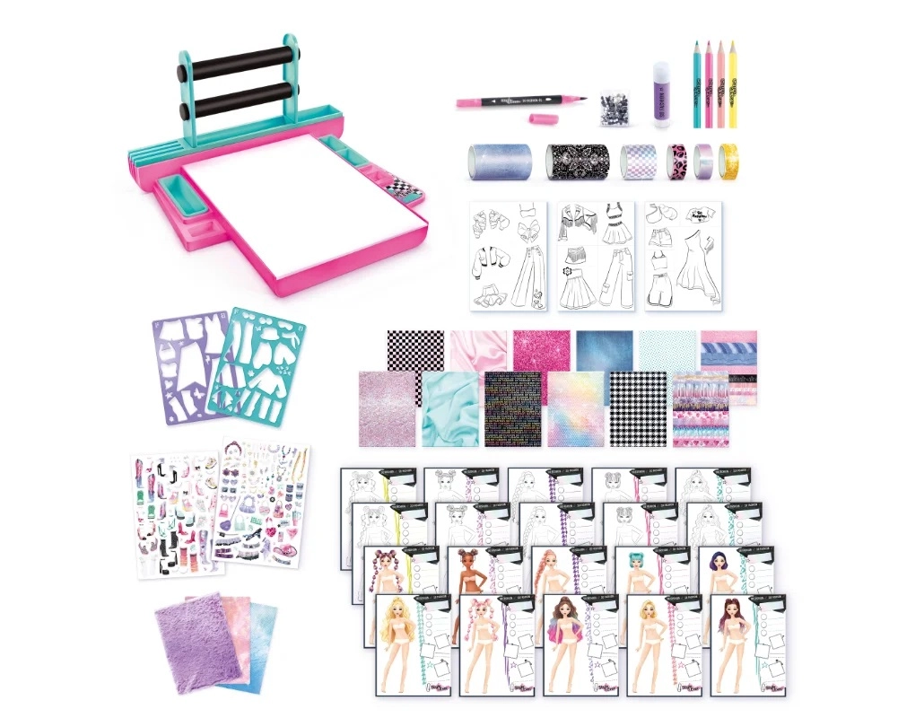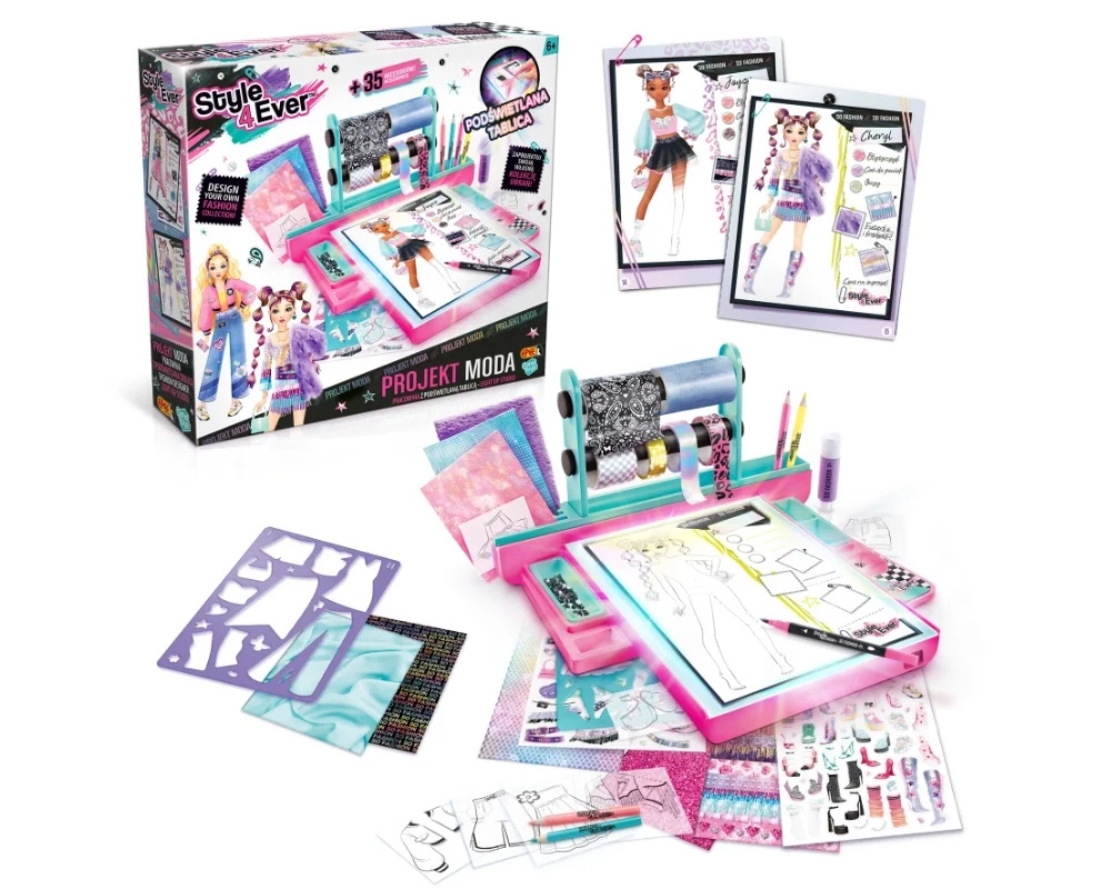 Cu acest set, copiii se transformă în mici designeri de modă. Planșa luminoasă facilitează copierea șabloanelor electrostatice și clasice, astfel iau naștere propuneri curate și ingenioase. Apoi rămâne doar decorarea cu hârtii imprimate, materiale autoadezive, benzi washi și cristale – iar colecția originală prinde viață.