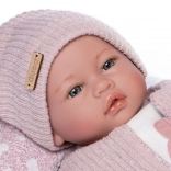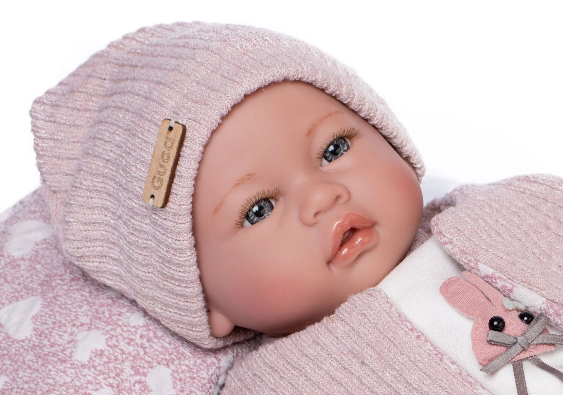Adorabila păpușă realistă bebeluș, cu corp textil moale și sunet de râs la apăsarea pieptului, va bucura orice copil. Datorită membrelor articulate pe încheieturi, poate și să stea în șezut. Mărime 46 cm, realizată manual în Spania, ambalaj elegant pentru cadou. Potrivită de la 3 ani.