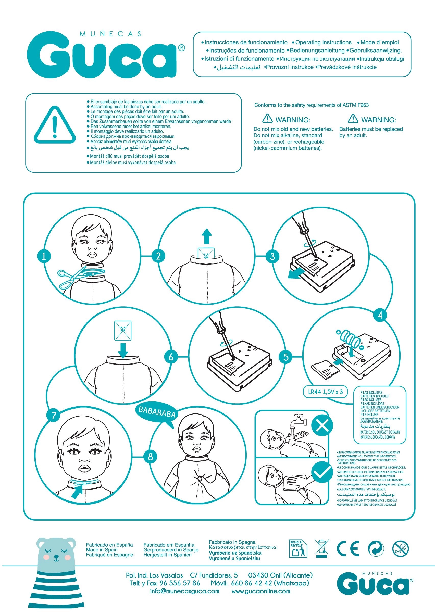 Păpușa este realizată manual în Spania cu atenție la detalii și calitate. Se livrează într-o cutie pentru cadou, fiind un cadou ideal. Pachetul include și 3 baterii tip pastilă LR44 și instrucțiuni pentru înlocuirea acestora.