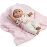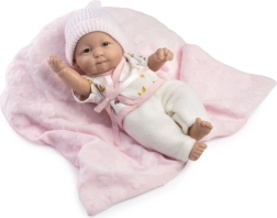Un bebeluș adorabil cu corp integral din vinil și detalii realiste va bucura micii îngrijitori. Păpușa este articulată, poate sta așezată, are brațe și picioare prinse pe articulații și este potrivită și pentru baie. Realizată manual în Spania, livrată într-o cutie cadou, ideală pentru a fi oferită în dar.