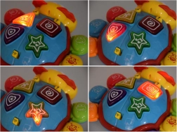 Prin apăsarea butoanelor colorate, copiii se familiarizează cu culorile și animalele; butonul de quiz cu semnul întrebării provoacă la sarcini simple.