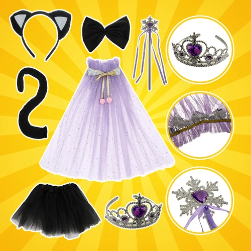 - Fustiță din tul (tutu), pelerină, coroniță, baghetă magică, bentiță cu urechi de pisică, coadă, papion