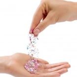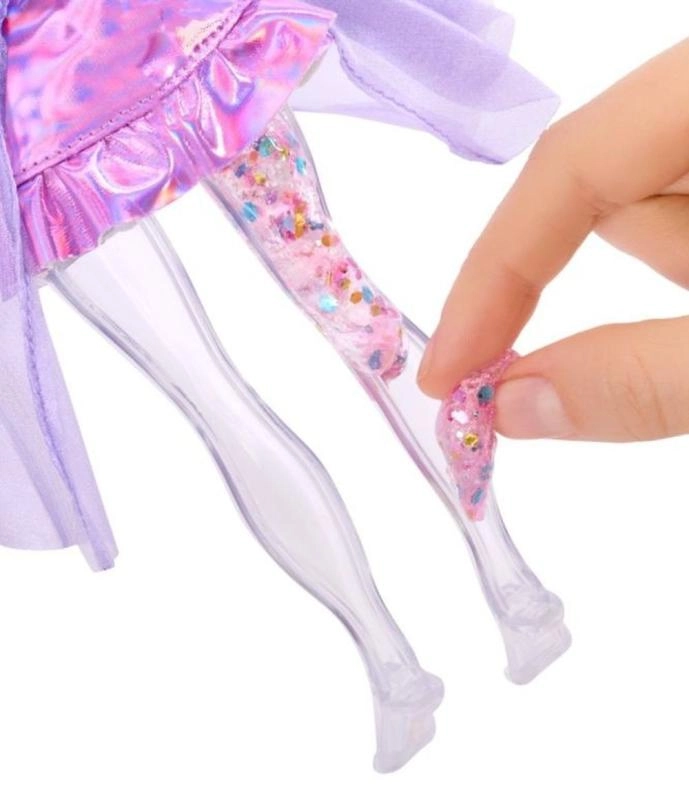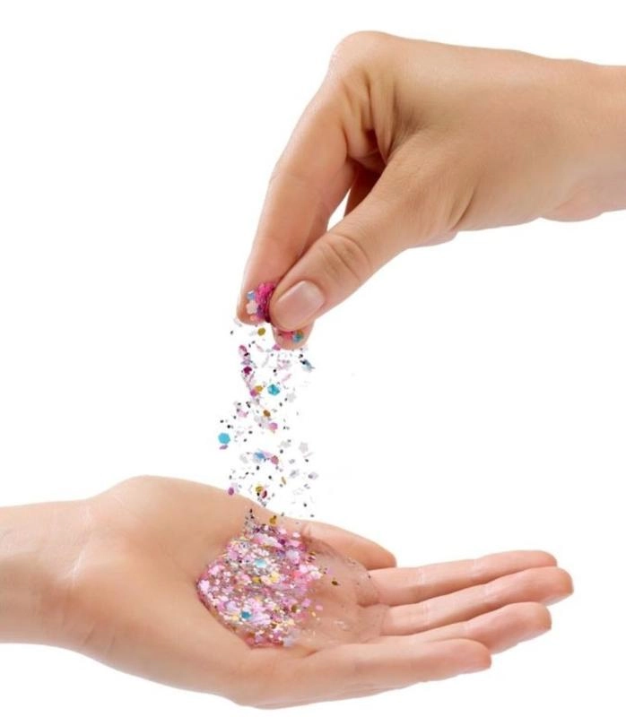 Amestecă slime-ul transparent cu sclipici și introdu-l în picioarele transparente ale păpușii. Creezi instant un stil nou, strălucitor – și îl poți schimba la nesfârșit.