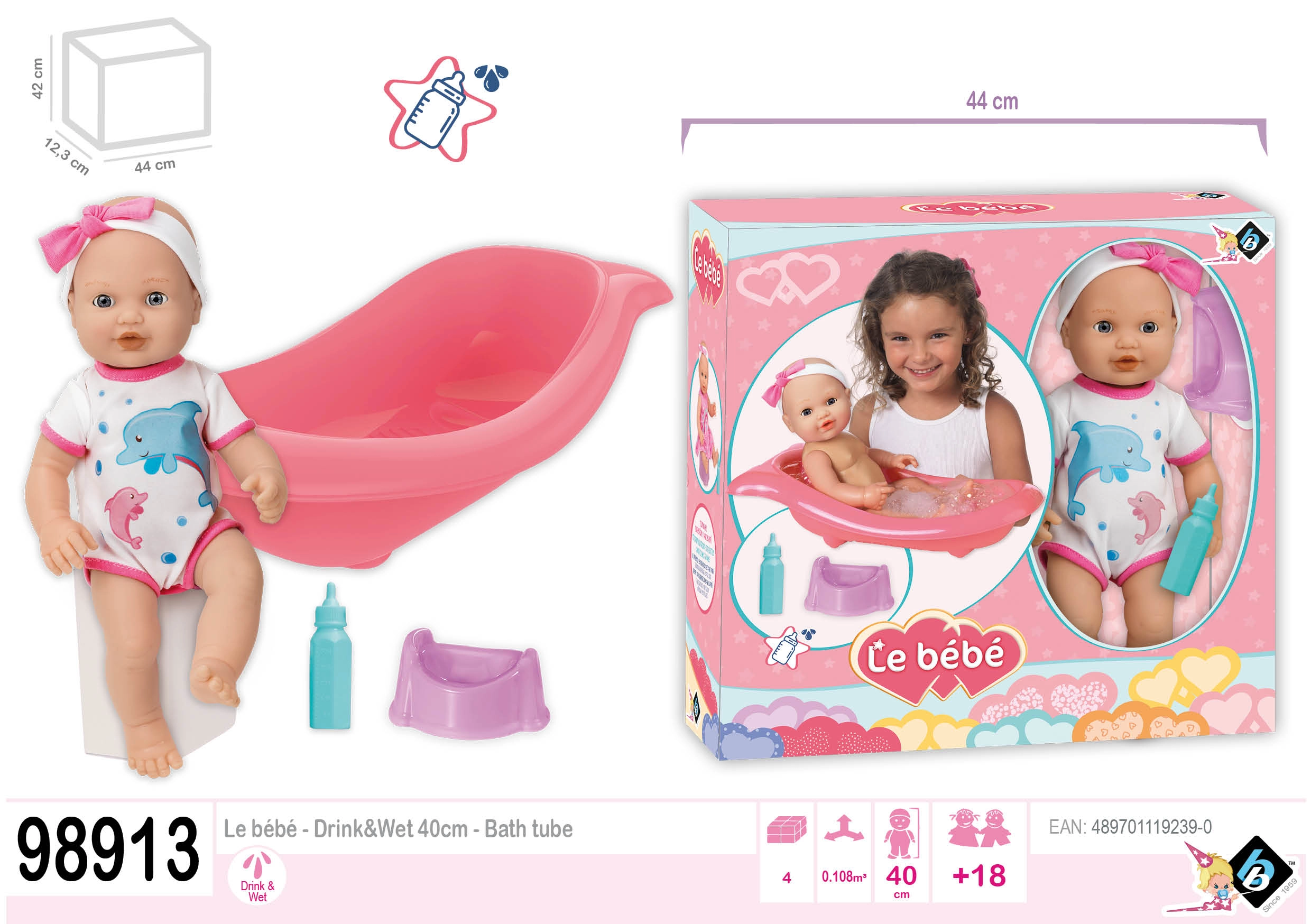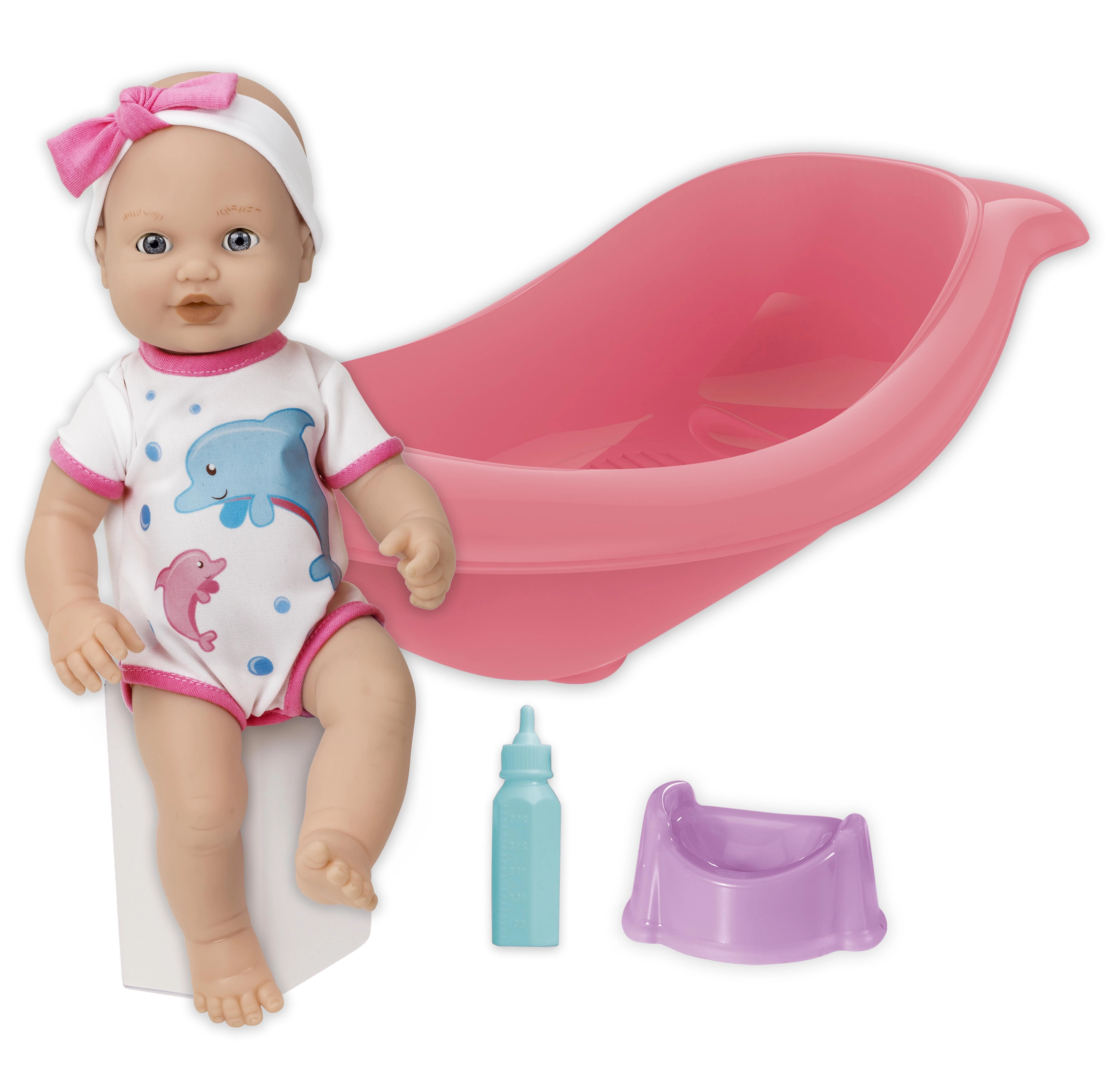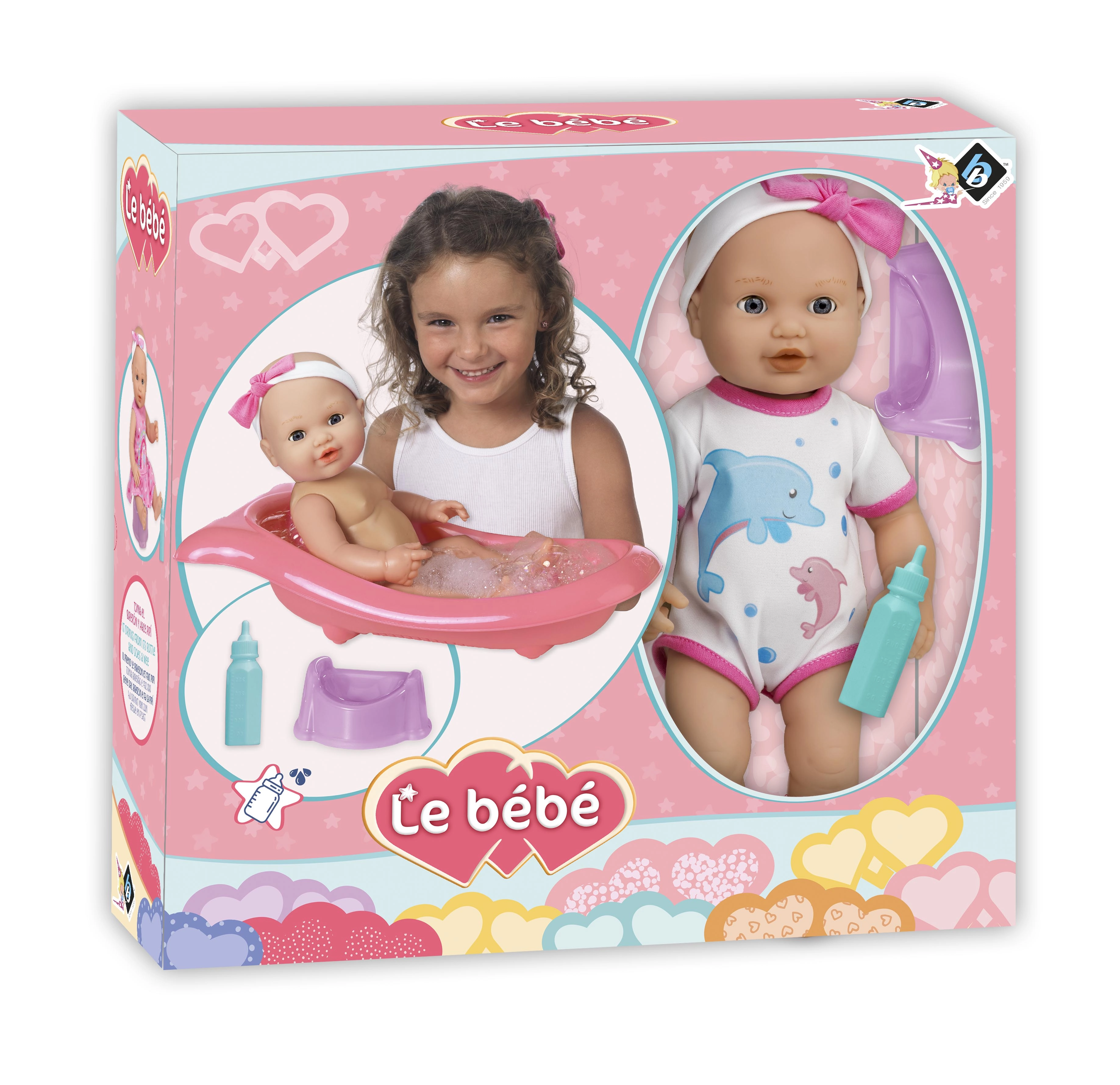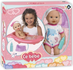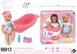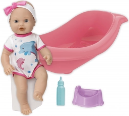 O păpușă adorabilă cu set pentru baie și schimbat scutece va bucura orice copil. Pachetul include o cădiță cu lungimea de 41 cm, o sticluță și un oliță. Păpușa are cap și membre mobile și, când este așezată pe spate, închide ochii. Datorită funcției de pipi după ce bea din sticluță, copiii se bucură de un joc realist de îngrijire.