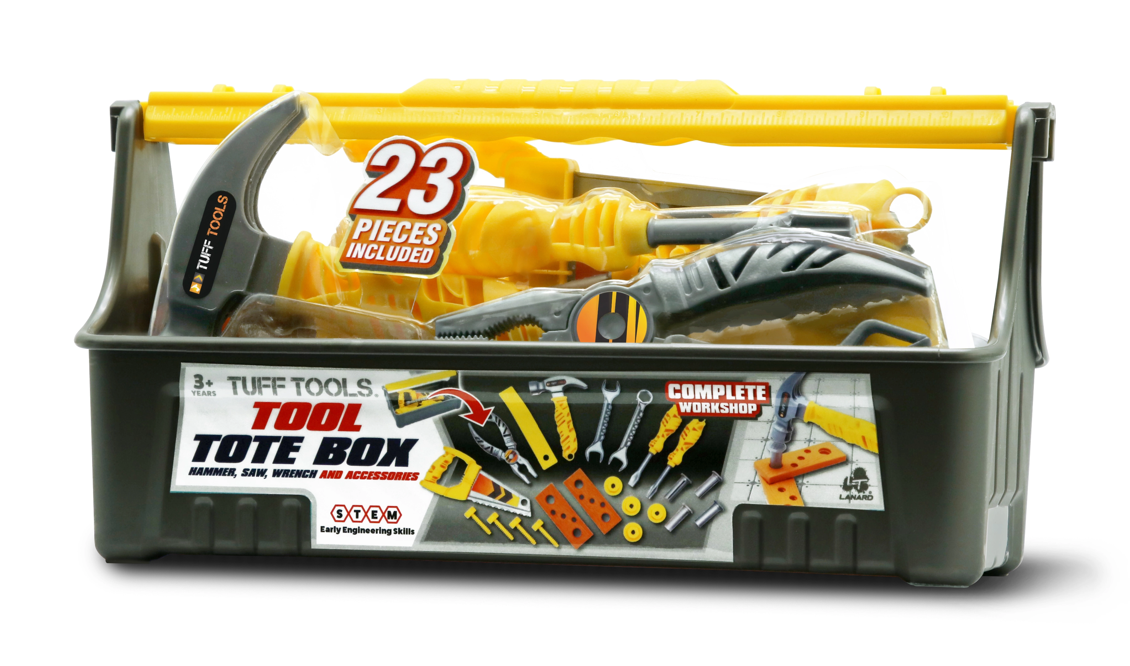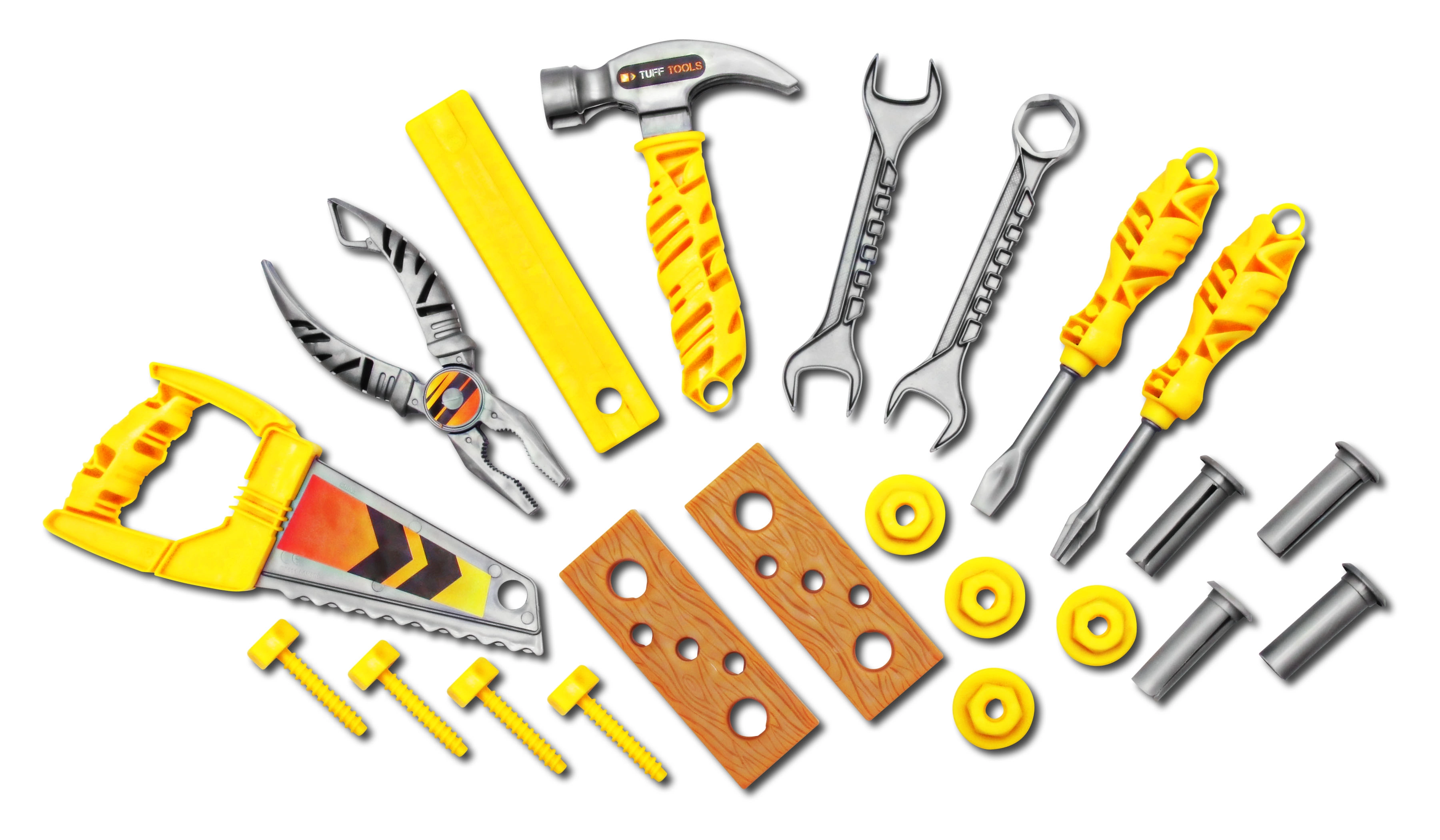 Setul pentru copii Tuff Tools, într-o trusă solidă, oferă o dotare bogată pentru joacă realistă. Datorită pieselor galbene și gri bine vizibile, copiii își însușesc ușor abilități de bază precum înșurubarea, baterea cuielor și asamblarea. Mânerul detașabil funcționează ca riglă, sprijinind precizia și dezvoltarea motricității fine.