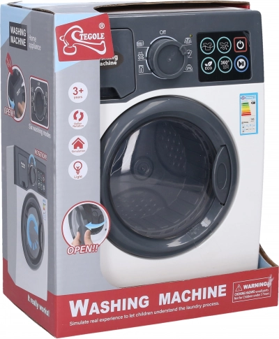Această mașină de spălat pentru copii aduce o experiență autentică a spălării într-o formă sigură și distractivă. Este suficient să apeși butonul on/off, să alegi programul și să pornești spălarea cu butonul go/stop. Datorită efectelor, imită funcționarea reală a unei mașini de spălat și dezvoltă imaginația și abilitățile motorii ale copiilor.
