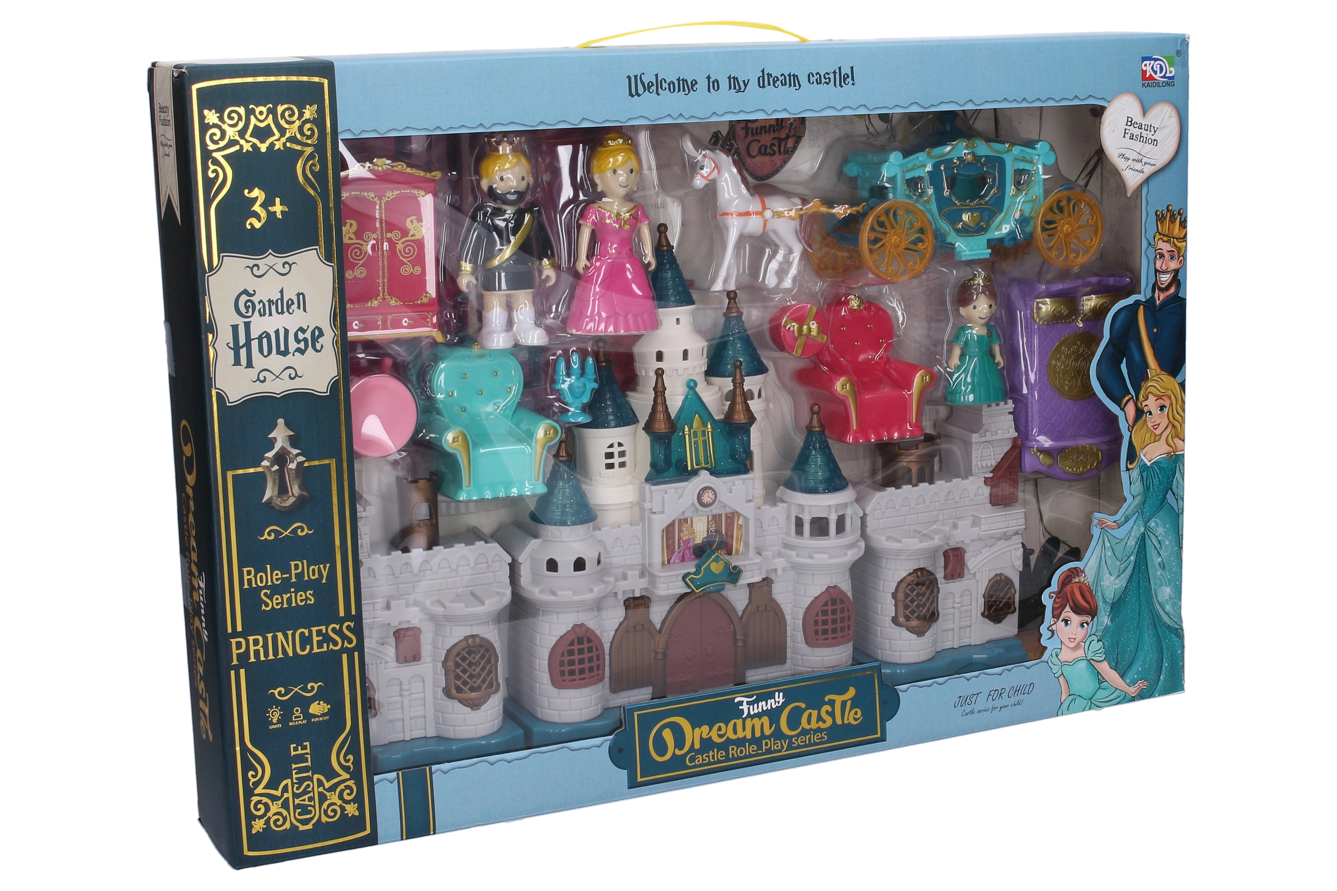 Setul include 3 figurine, o trăsură cu cal elegantă și mobilier suplimentar, datorită cărora se pot crea nenumărate povești. Castelul este pliabil, ușor de transportat și pregătit pentru joacă imediată – bateriile sunt deja în pachet.