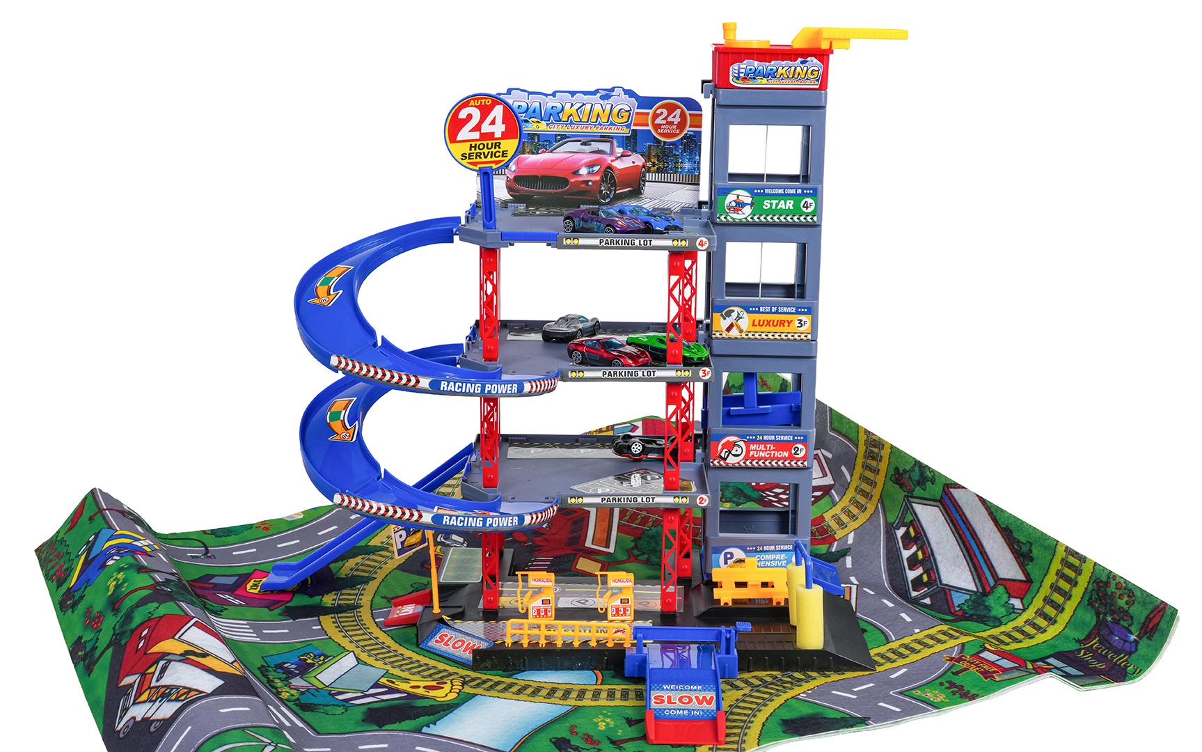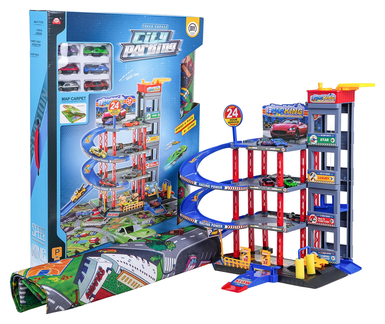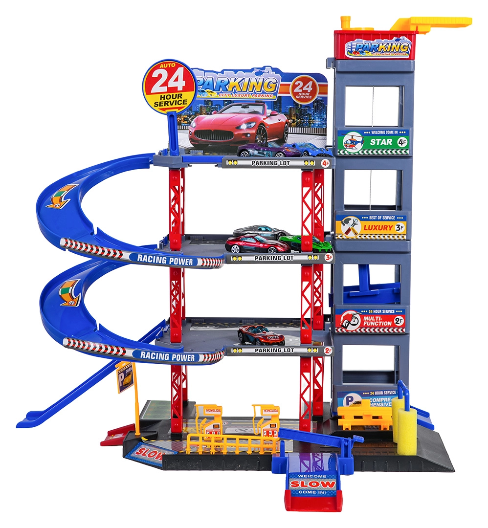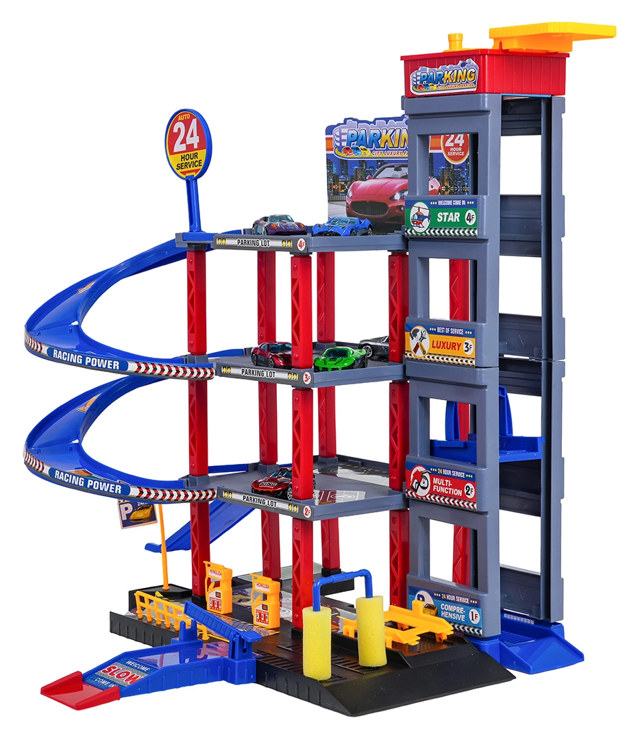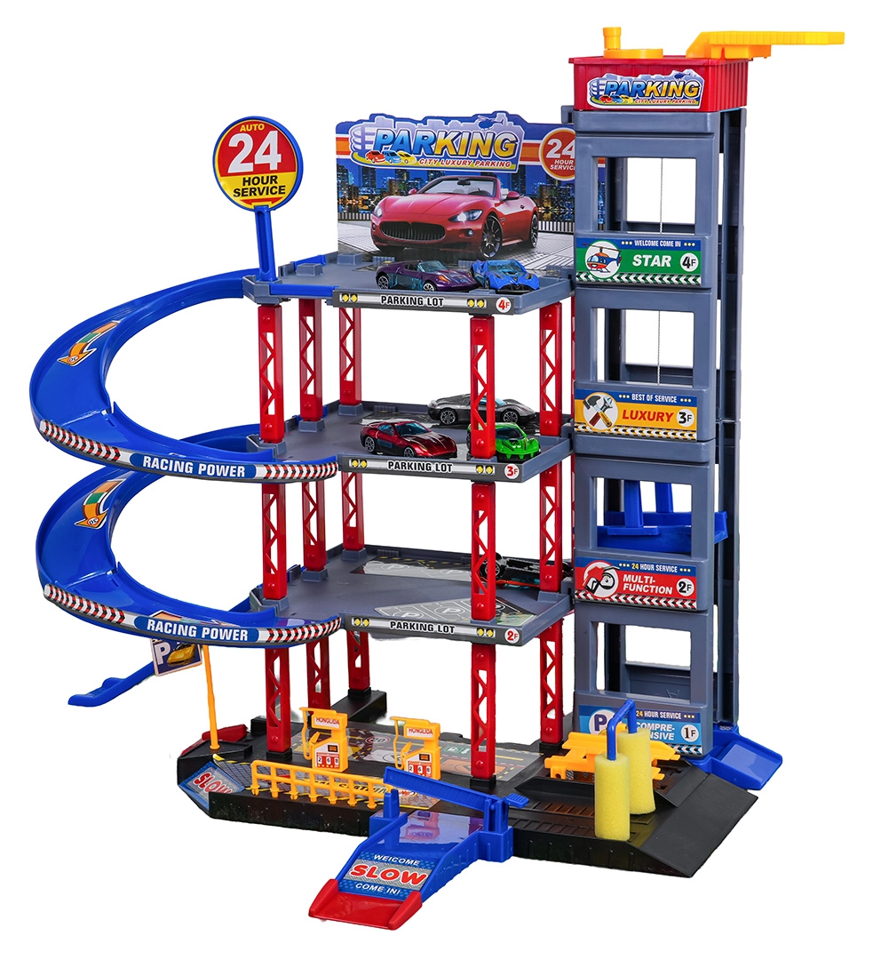 Descoperă distracția pentru micii șoferi: parcare robustă pe mai multe etaje, cu lift manual, rampe în spirală și un covoraș de joacă mare cu drumuri. Include 6 mașinuțe metalice, stație de alimentare, spălătorie, service subteran cu cric și piste de coborâre pentru curse pentru joc dinamic și dezvoltarea motricității.