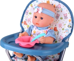 Oferiți-le copiilor bucuria unui set realist de îngrijire a bebelușului, care include tot ce este necesar pentru ritualurile zilnice – de la hrănire și plimbare până la culcare. Păpușa are membre mobile, hăinuțe moi și stă așezată în scăunel și în cărucior. Căruciorul și pătuțul au cadru ușor și pliabil, astfel că se transportă ușor și se depozitează rapid.