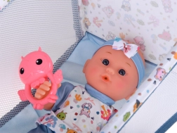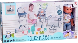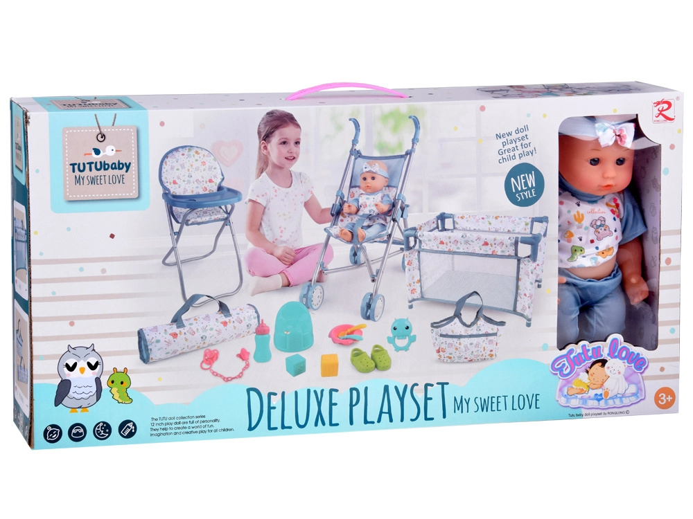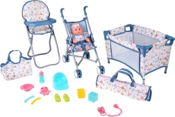 Set de joacă complet pentru micii îngrijitori: o păpușă bebeluș adorabilă cu dotări bogate pentru hrănire, schimbat, somn și plimbări. Include cărucior pliabil, scăunel de masă, pătuț de voiaj cu geantă, oliță, biberon, bol cu linguriță și furculiță, suzetă cu lanțișor, jucării și botoșei. Acest set dezvoltă empatia, creativitatea și abilitățile de role-play și oferă ore de distracție acasă și în călătorii.