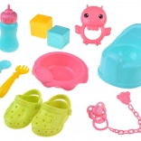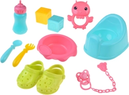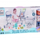 Dotările practice includ set de masă (bol, tacâmuri și biberon), oliță, suzetă cu lanțișor, cubișoare colorate și un zornăitor. Pătuțul de voiaj cu laterale din plasă respirabilă și geantă este ideal pentru joacă și depozitare. Datorită accesoriilor numeroase, copiii pot imita cu ușurință îngrijirea reală a unui bebeluș și își dezvoltă comunicarea și motricitatea fină.