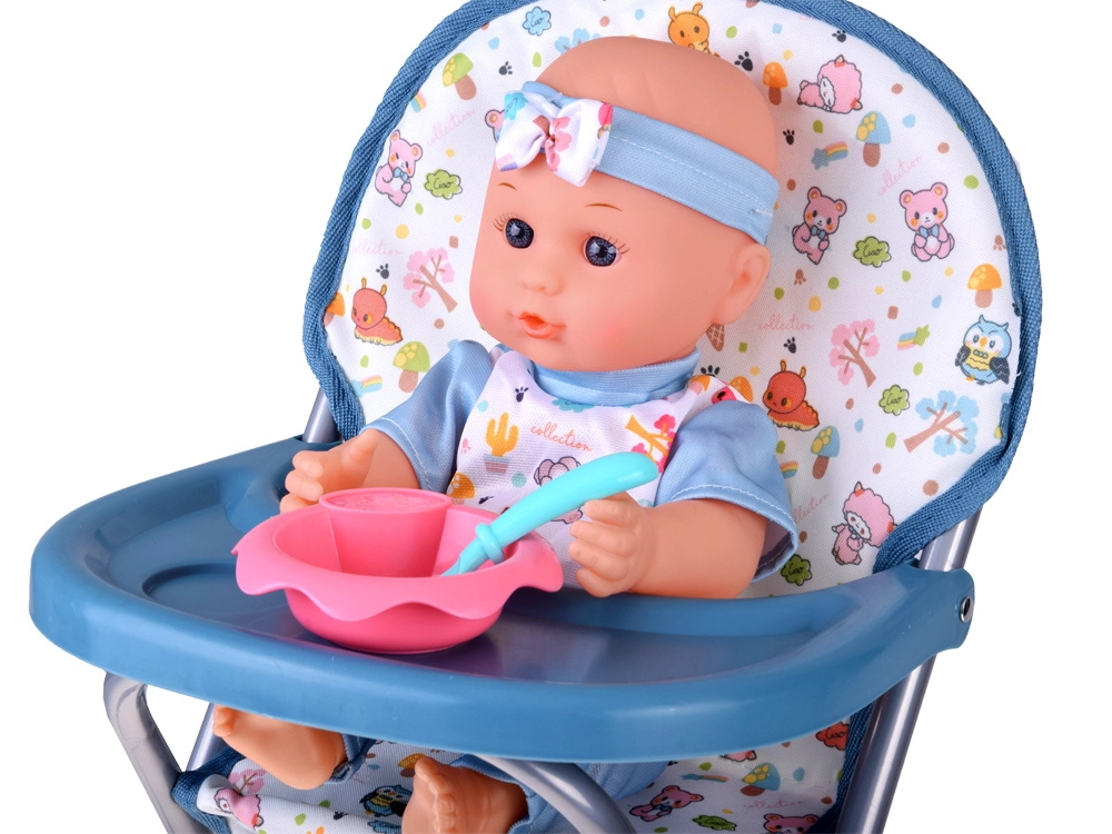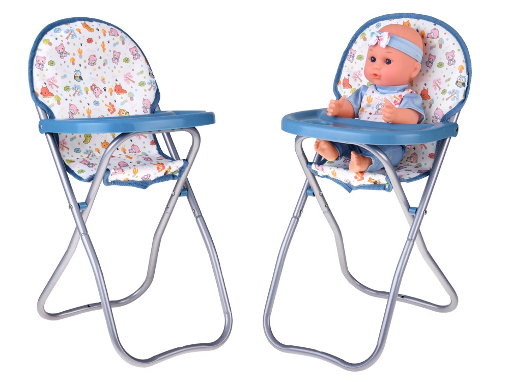 Scăunel pliabil stabil, cu tavă și spațiu pentru bol și tacâmuri. Susține jocul realist de hrănire și servire la masă cu păpușa.