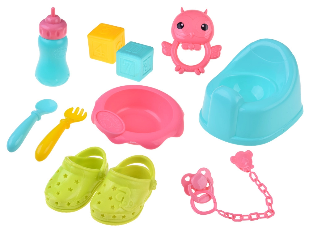 - Bol, linguriță, furculiță, biberon, oliță, suzetă cu lanțișor, zornăitor, cubișoare, geantă