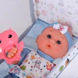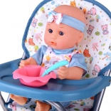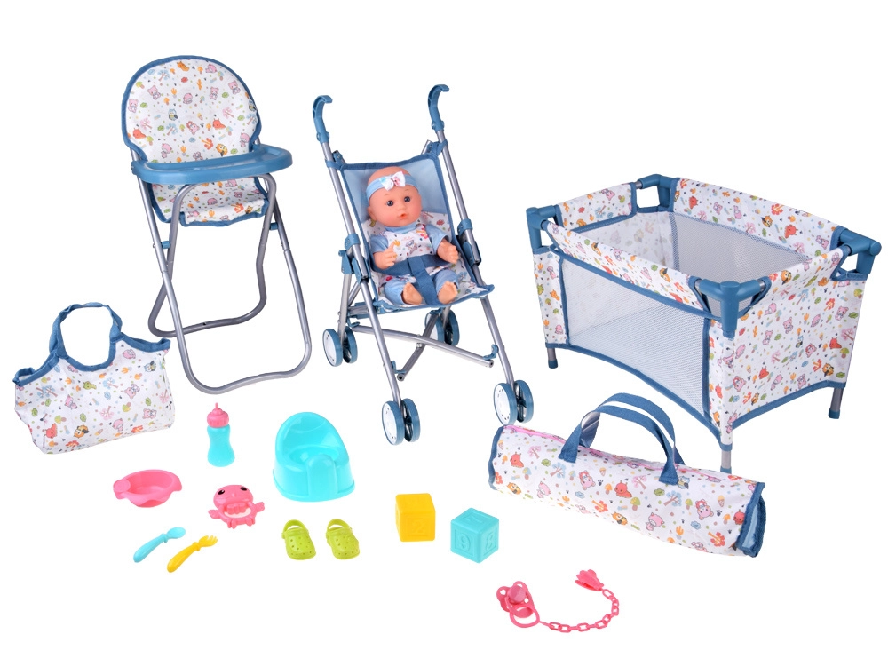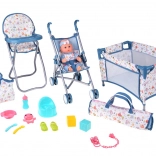 - Set pentru păpușă – păpușă bebeluș cu cărucior, pătuț, scăunel și accesorii