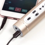 Acest microfon karaoke portabil este ideal pentru divertisment acasă, aniversări și petreceri. Datorită interfeței Bluetooth 4.2 îți poți conecta cu ușurință telefonul, tableta sau computerul, ori poți folosi conexiunea AUX sau redarea de pe card TF. Difuzoarele integrate 2×3 W oferă un sunet clar și suficient de puternic.