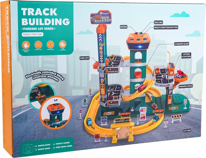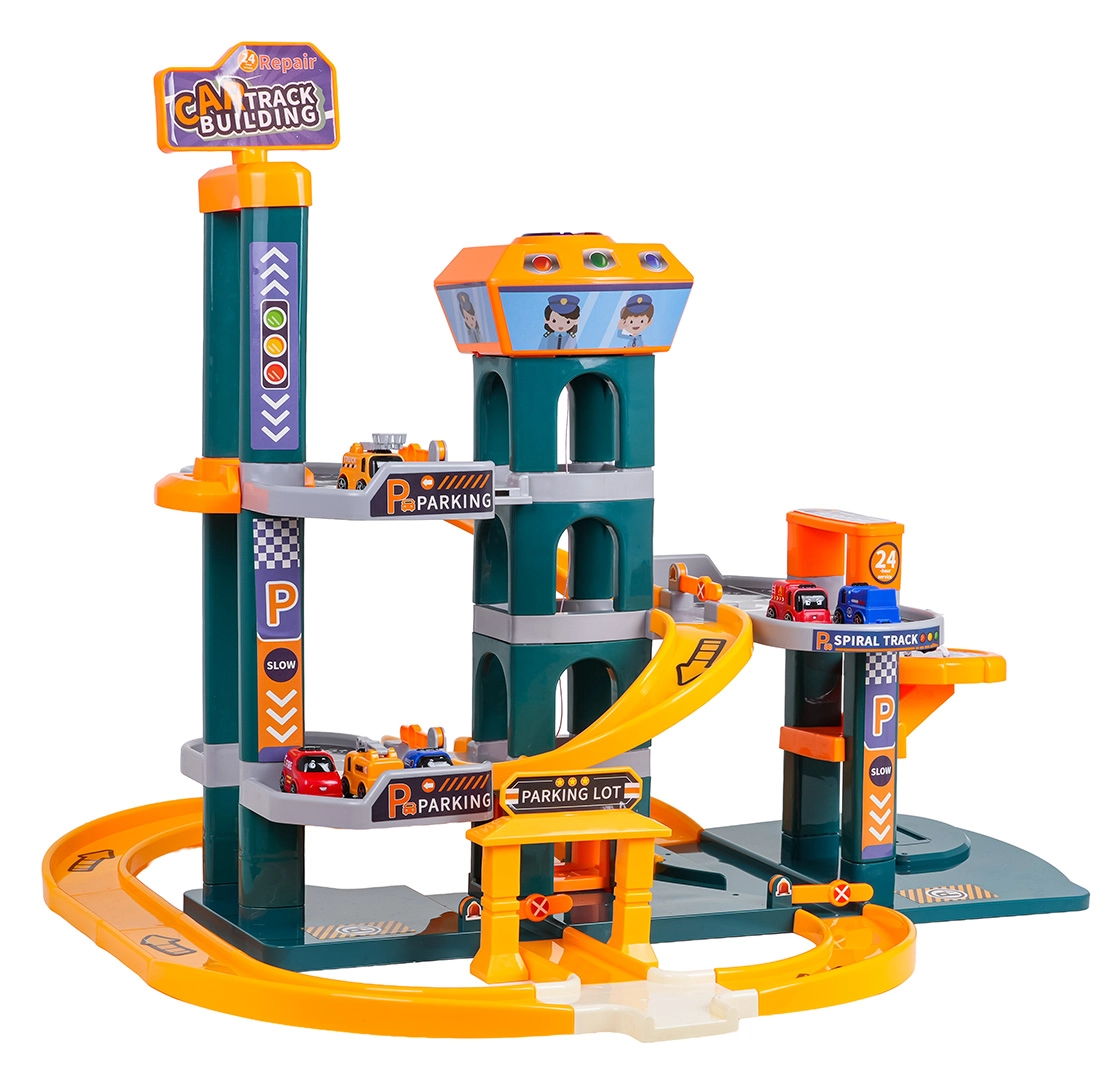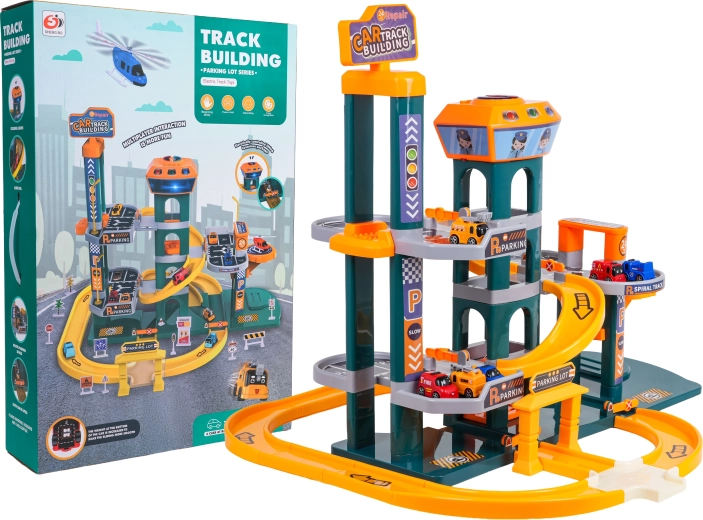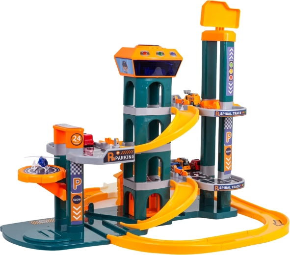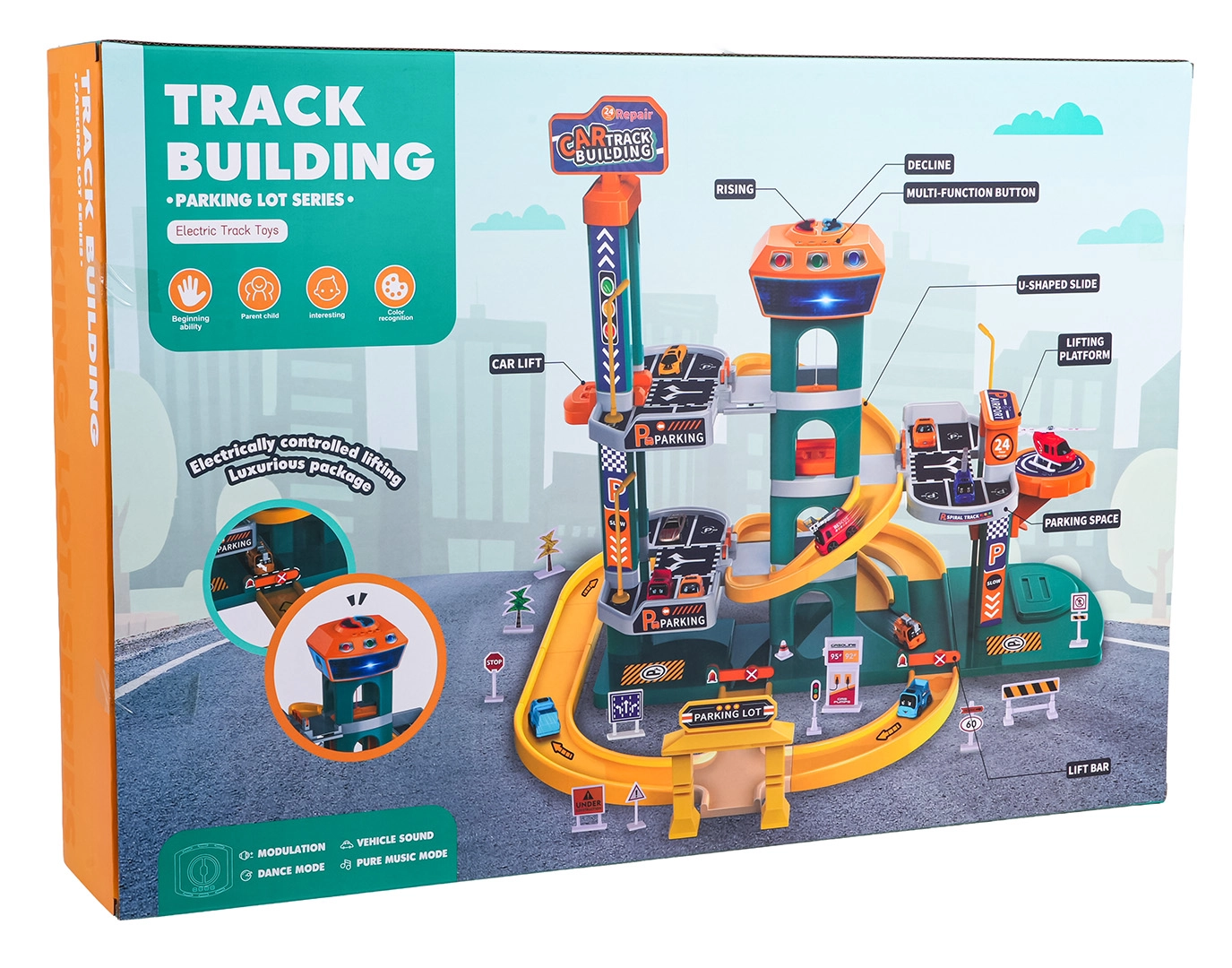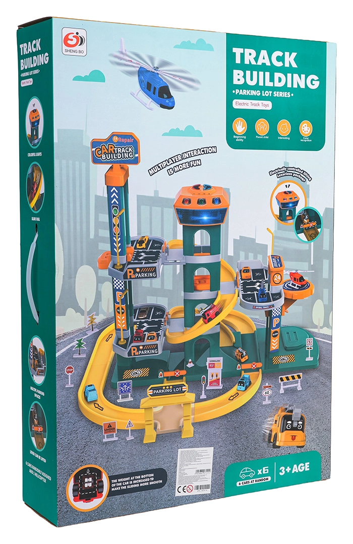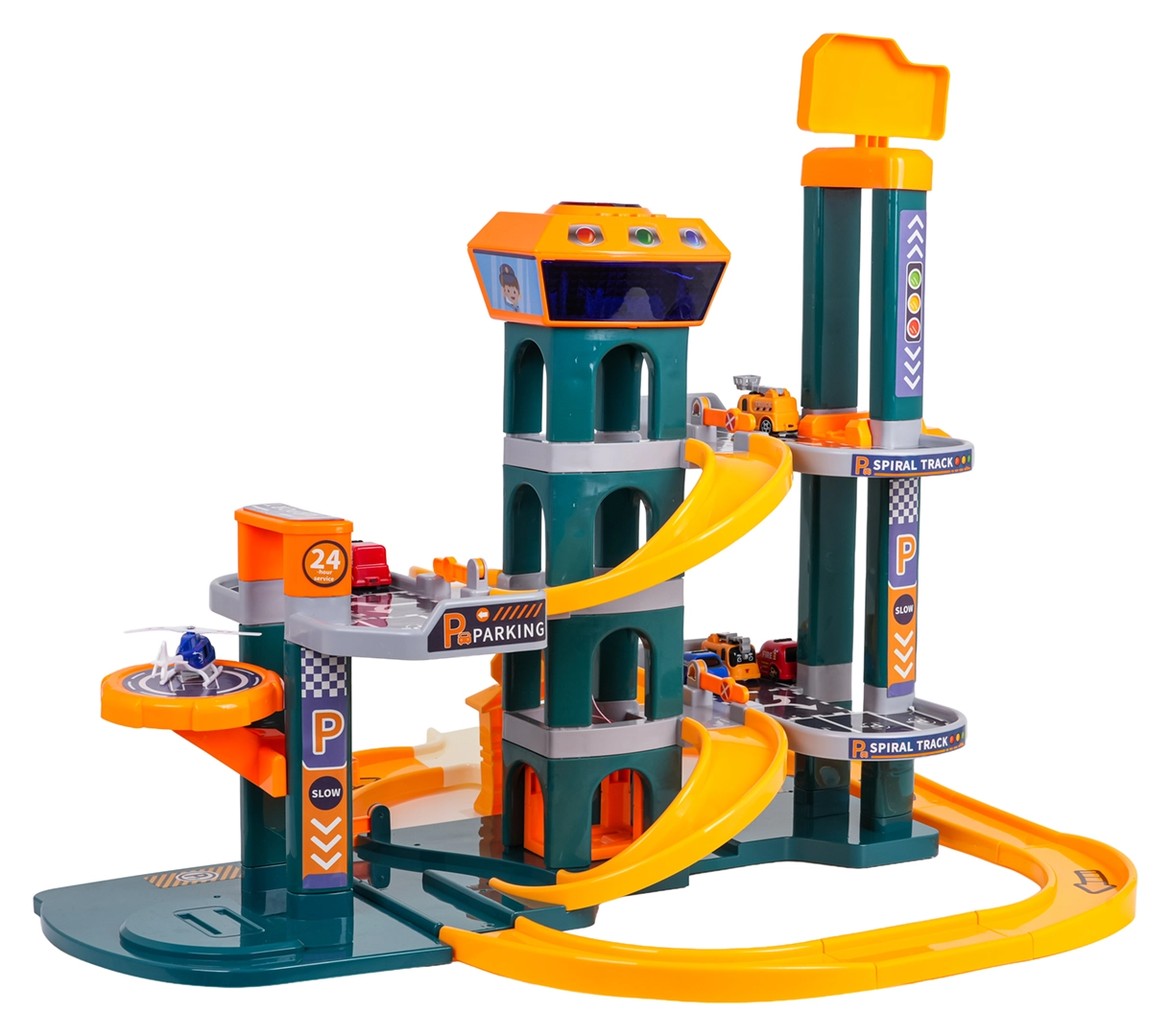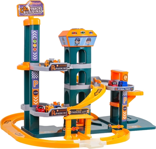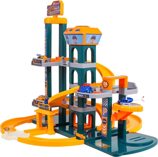 Trasee, coborâri și locuri de parcare variate susțin jocul creativ și întrecerile. Copiii pot alterna între urcarea cu liftul și coborârea pe pista în spirală.