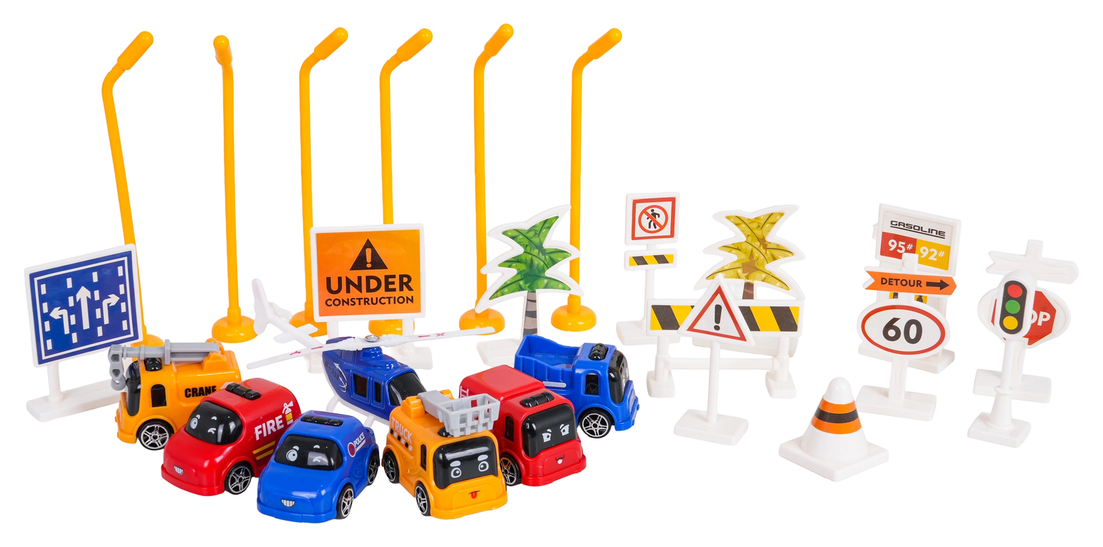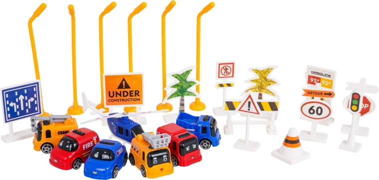 - 6× mașinuță (2× macara, 2× pompieri, 2× poliție), 1× elicopter, indicatoare rutiere, bariere, lămpi, autocolante decorative